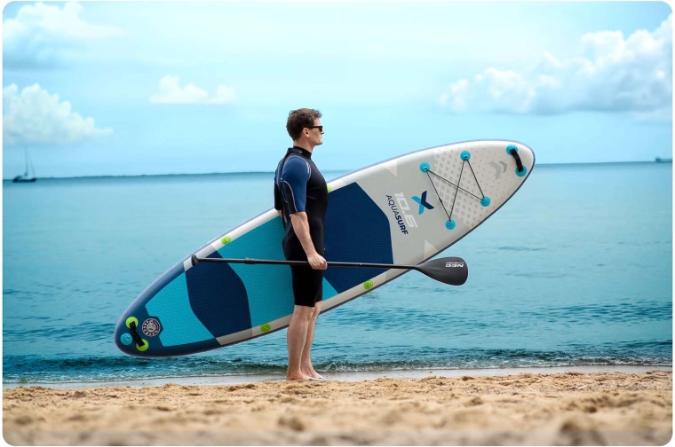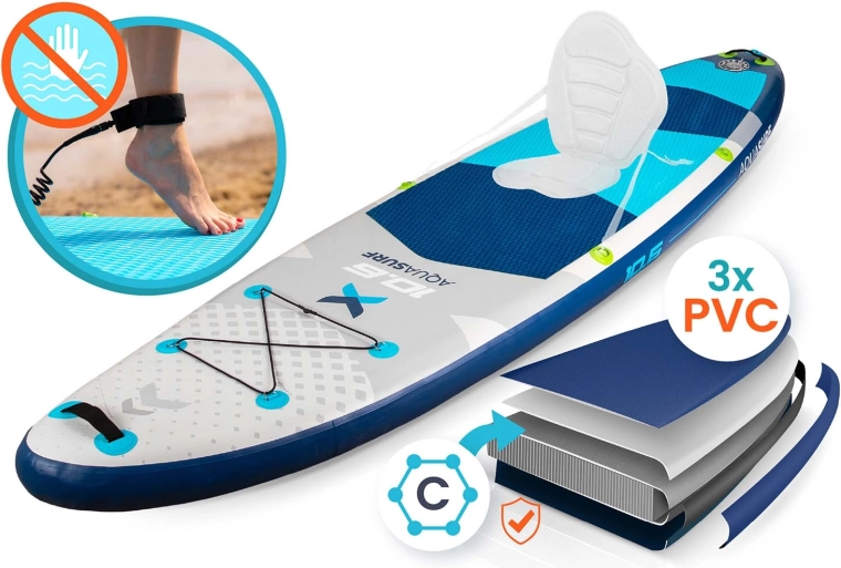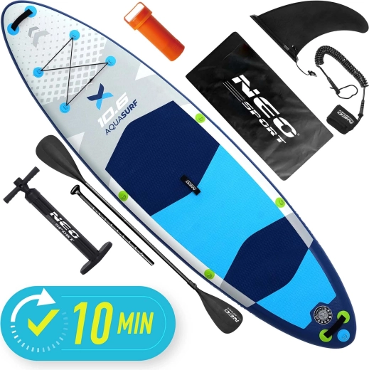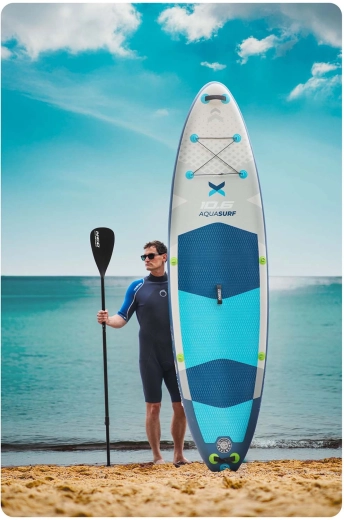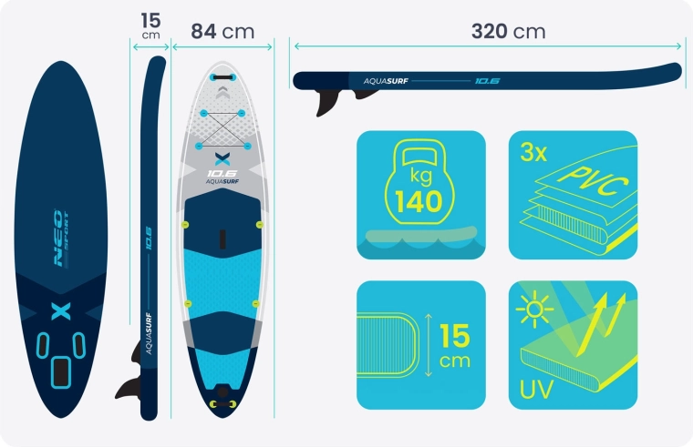 AQUASURF 10’6 paddleboardet tilbyder den ideelle kombination af stabilitet, manøvredygtighed og holdbarhed. Med en tykkelse på 15 cm og en bæreevne op til 140 kg er det perfekt til både begyndere og øvede, til afslapning, fitness og yoga på vandet. Den skridsikre EVA-skum holder fødderne sikkert – også når de er våde – mens tre finner (hovedfinne aftagelig + sidefinner) forbedrer retningsstabilitet og spor.