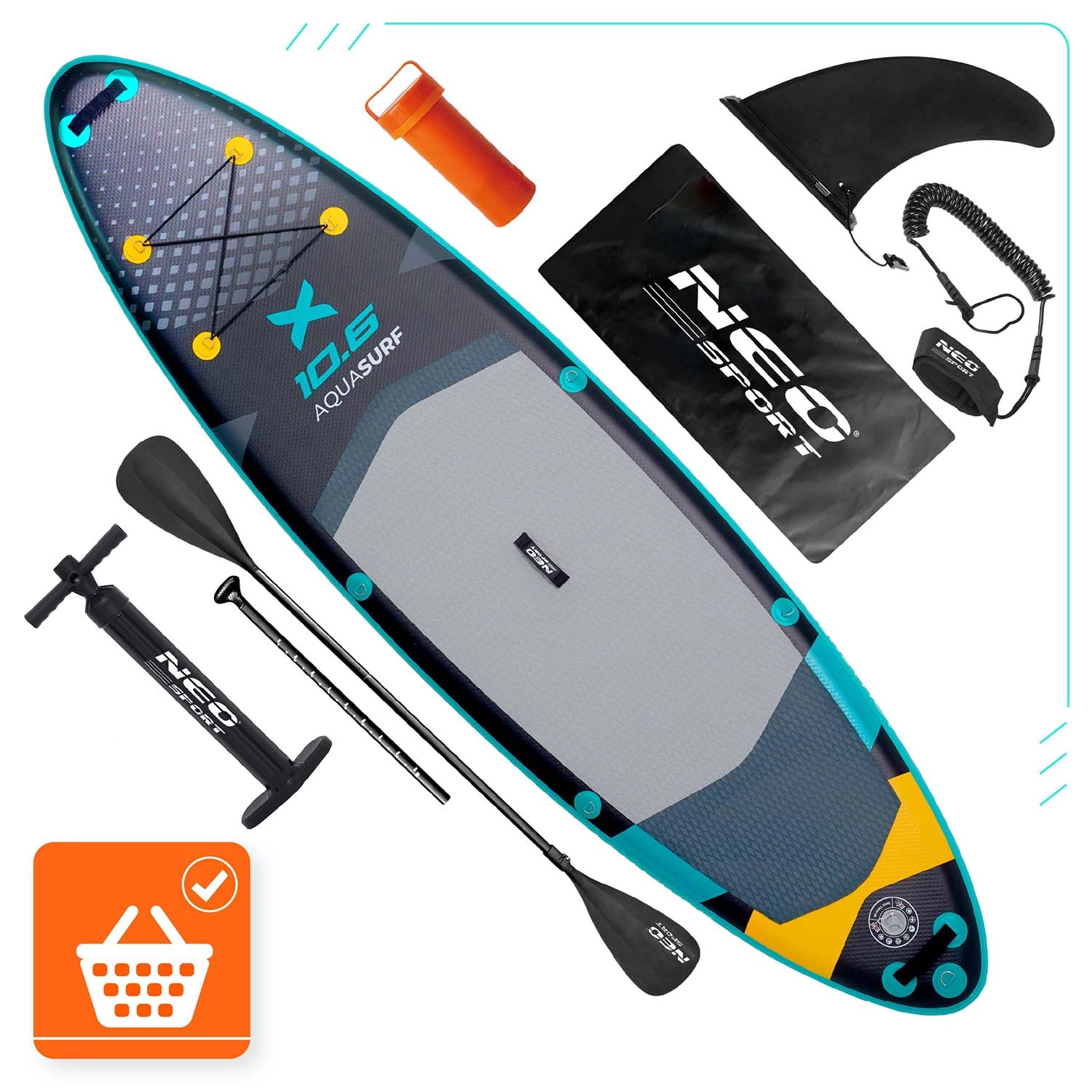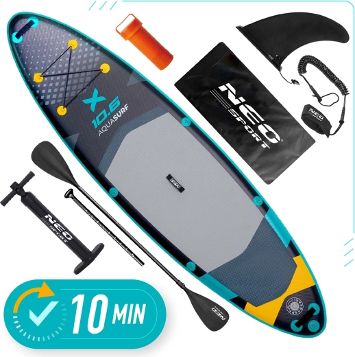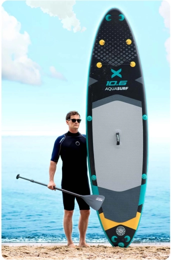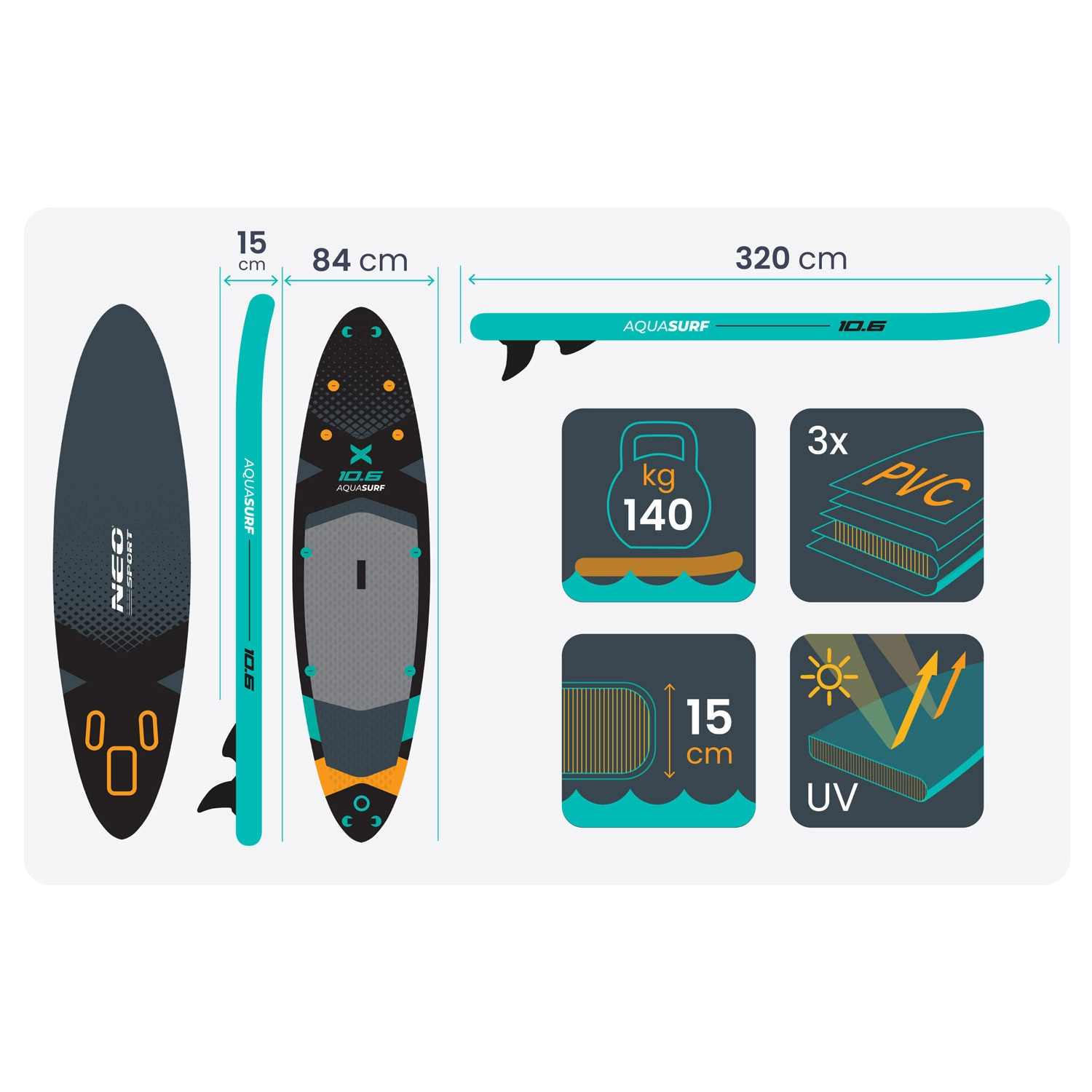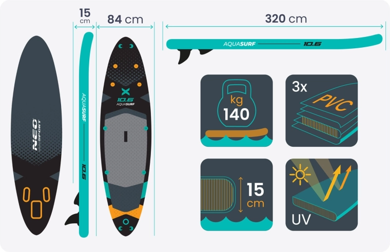 Paddleboardet Aquasurf 10’6 er designet til sikker fodfæste og komfort på hver tur. Den brede standflade, 15 cm tykkelse og tre stabiliseringsfinner sikrer rolig sejlads og nem manøvrering. Den skridsikre EVA-måtte holder også med våde fødder, og integrerede bungee-snore på dækket fastholder rygsæk, flaske eller jakke sikkert.