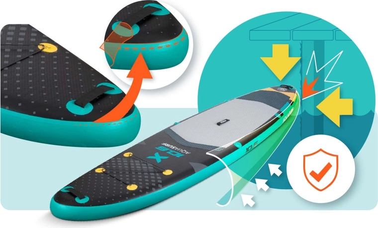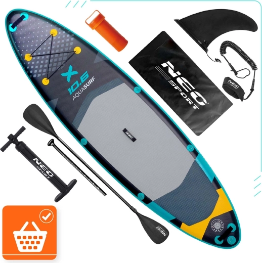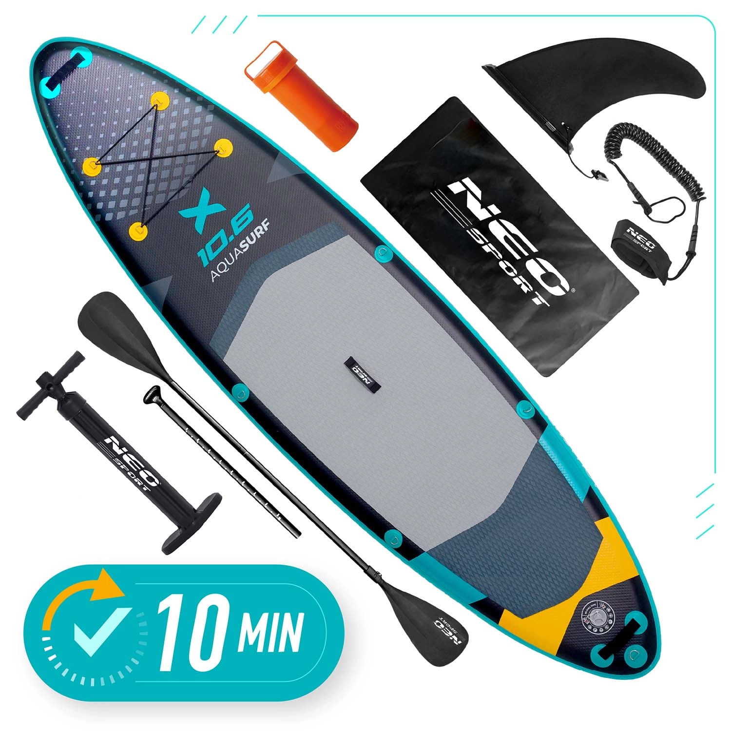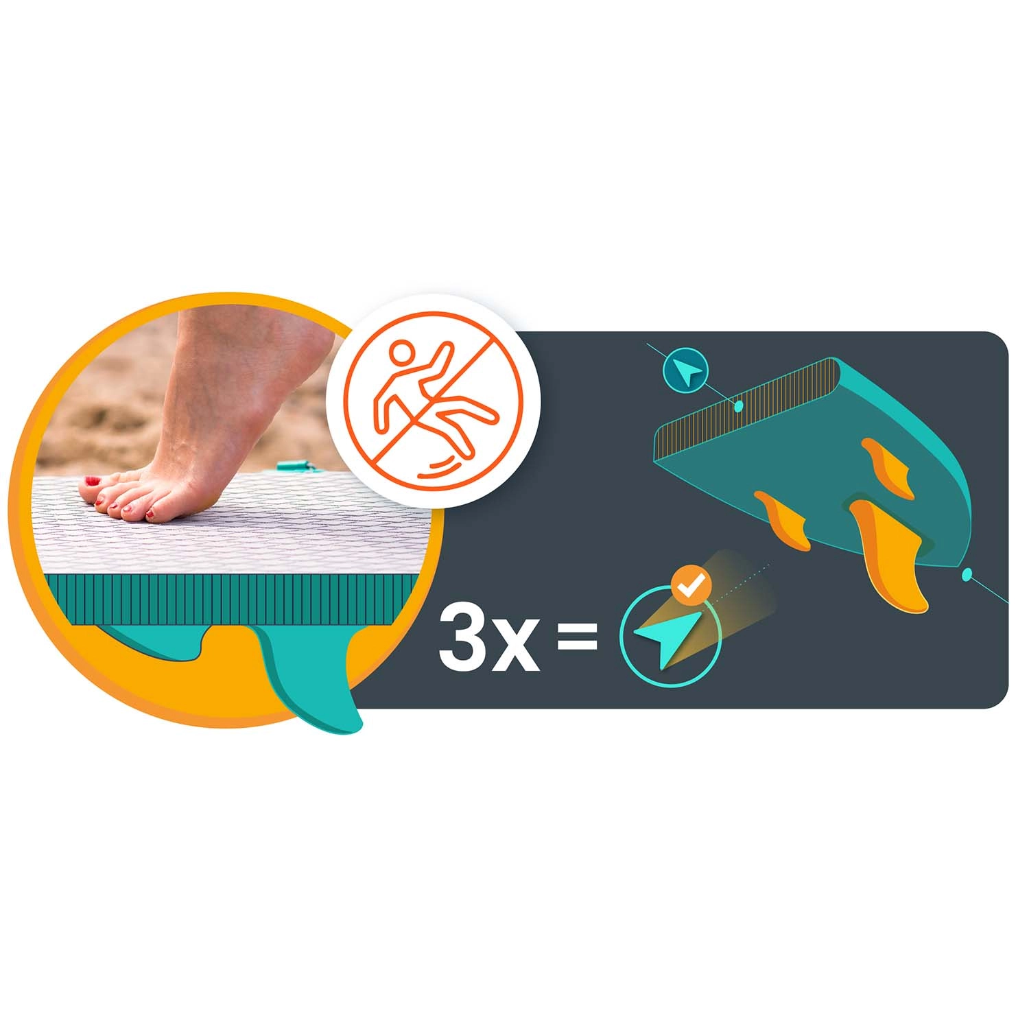 Paddleboardet Aquasurf 10’6 er designet til sikker fodfæste og komfort på hver tur. Den brede standflade, 15 cm tykkelse og tre stabiliseringsfinner sikrer rolig sejlads og nem manøvrering. Den skridsikre EVA-måtte holder også med våde fødder, og integrerede bungee-snore på dækket fastholder rygsæk, flaske eller jakke sikkert.