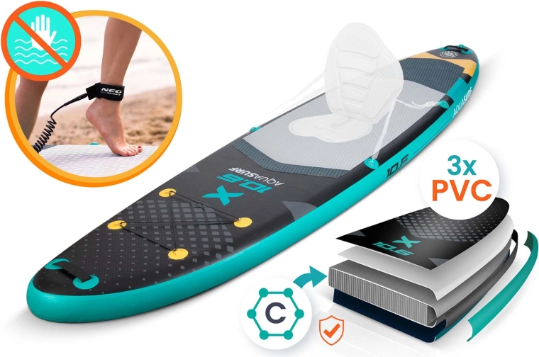 I pakken finder du alt, hvad du behøver: justerbar aluminiums-pagaj (162–210 cm), tovejspumpe med manometer, sikkerhedsleash, aftagelig finne, reparationssæt og en robust transportrygsæk. Den trelags PVC-konstruktion med Drop Stitch Light-teknologi, UV-resistent overflade og forstærkede kanter sikrer lang levetid – uanset om du er nybegynder eller vil forbedre din teknik.