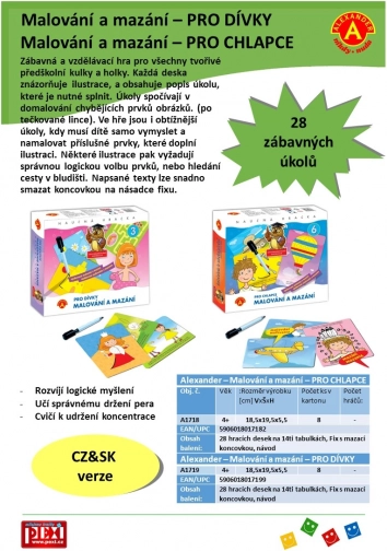 Sjovt læringsspil for førskolebørn med 28 opgaver på 14 laminerede tavler og en tusch med viskeende. Børnene træner under legen finmotorik, logisk tænkning og korrekt pennegreb. Let at skrive og viske ud, hvilket støtter kreativitet, koncentration og forberedelse til at skrive i skolen.