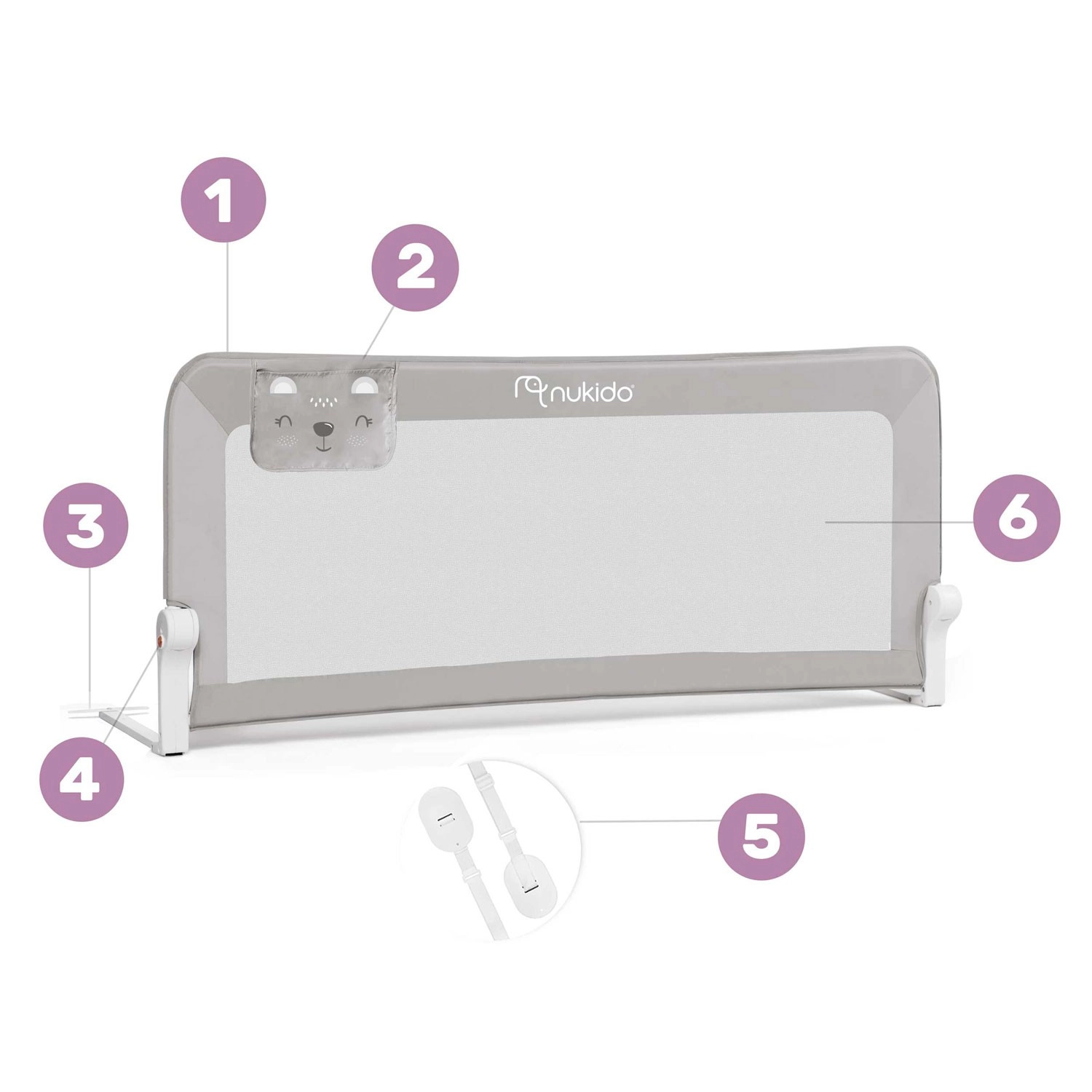 Nukido sengrælingen er et pålideligt sikkerhedselement for børn, som reducerer risikoen for fald fra sengen. Den solide, men lette stålramme og det åndbare net sikrer stabilitet, synlighed og behagelig luftgennemstrømning. Den integrerede lås forhindrer utilsigtet sammenklapning, og 180° nedfældning giver nem adgang uden afmontering.
