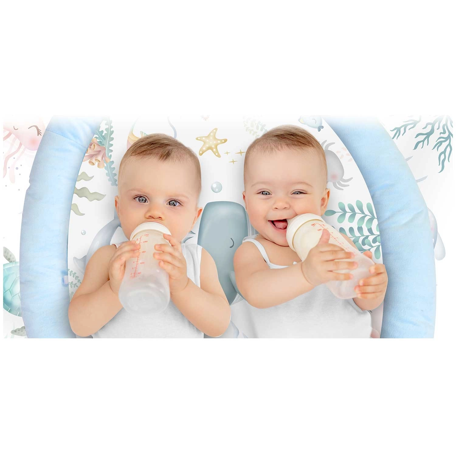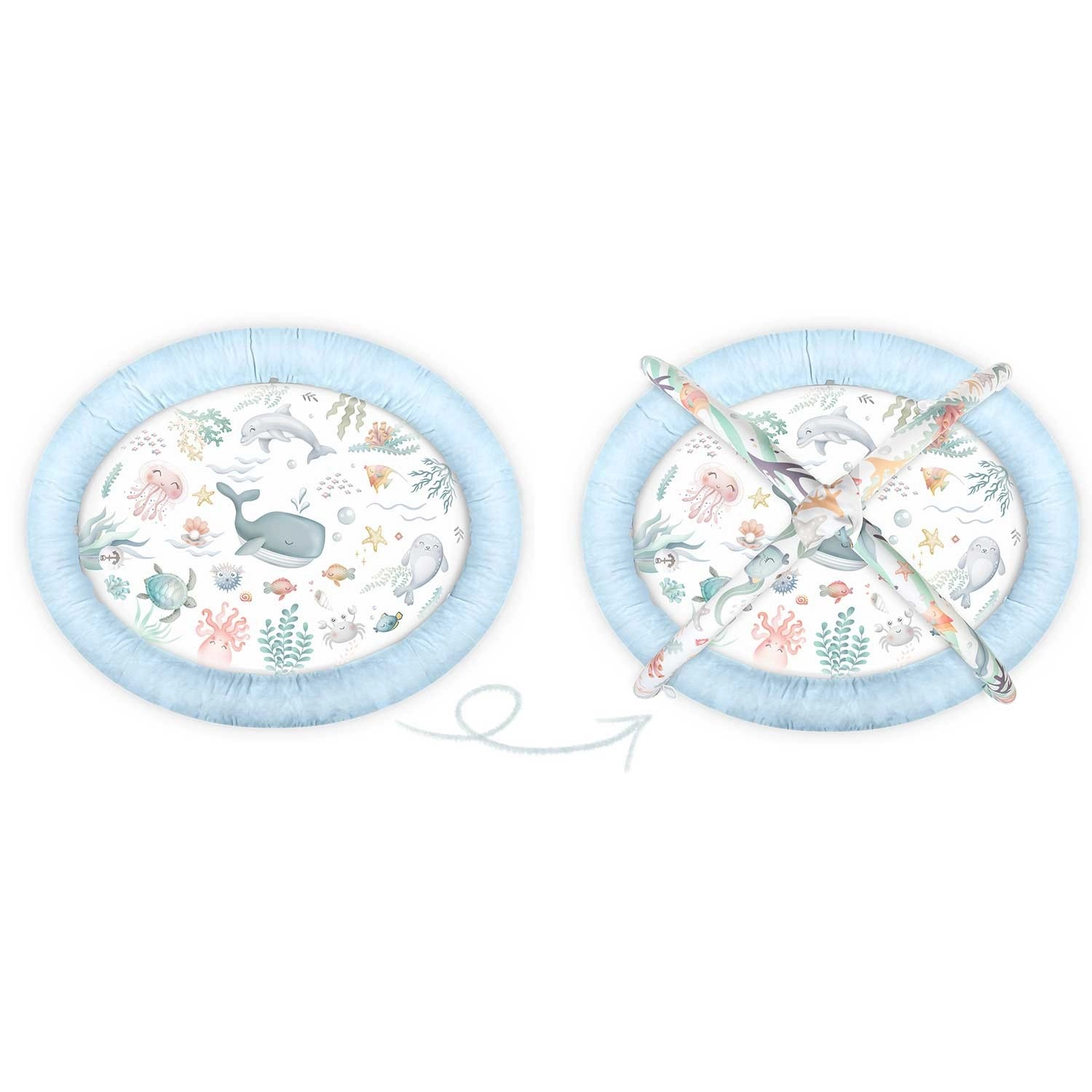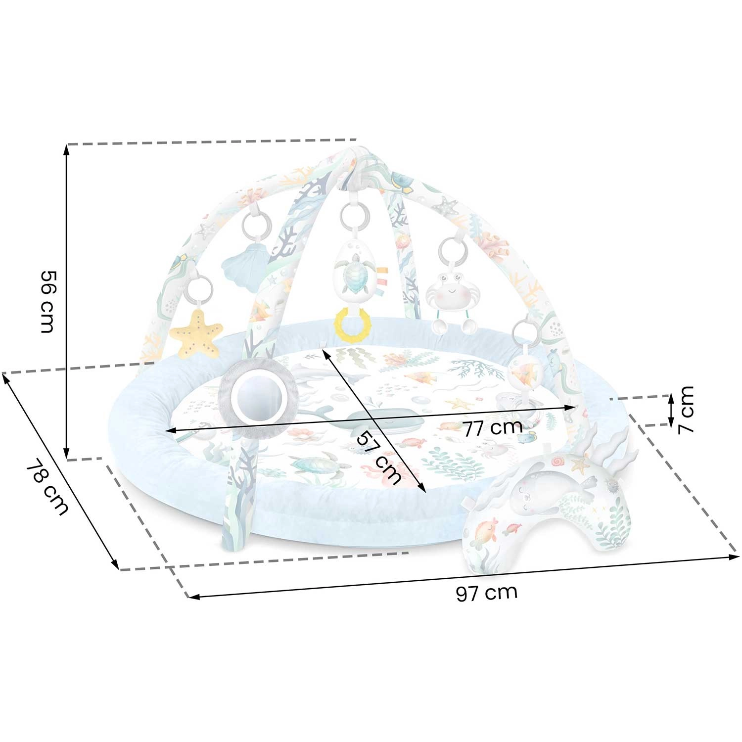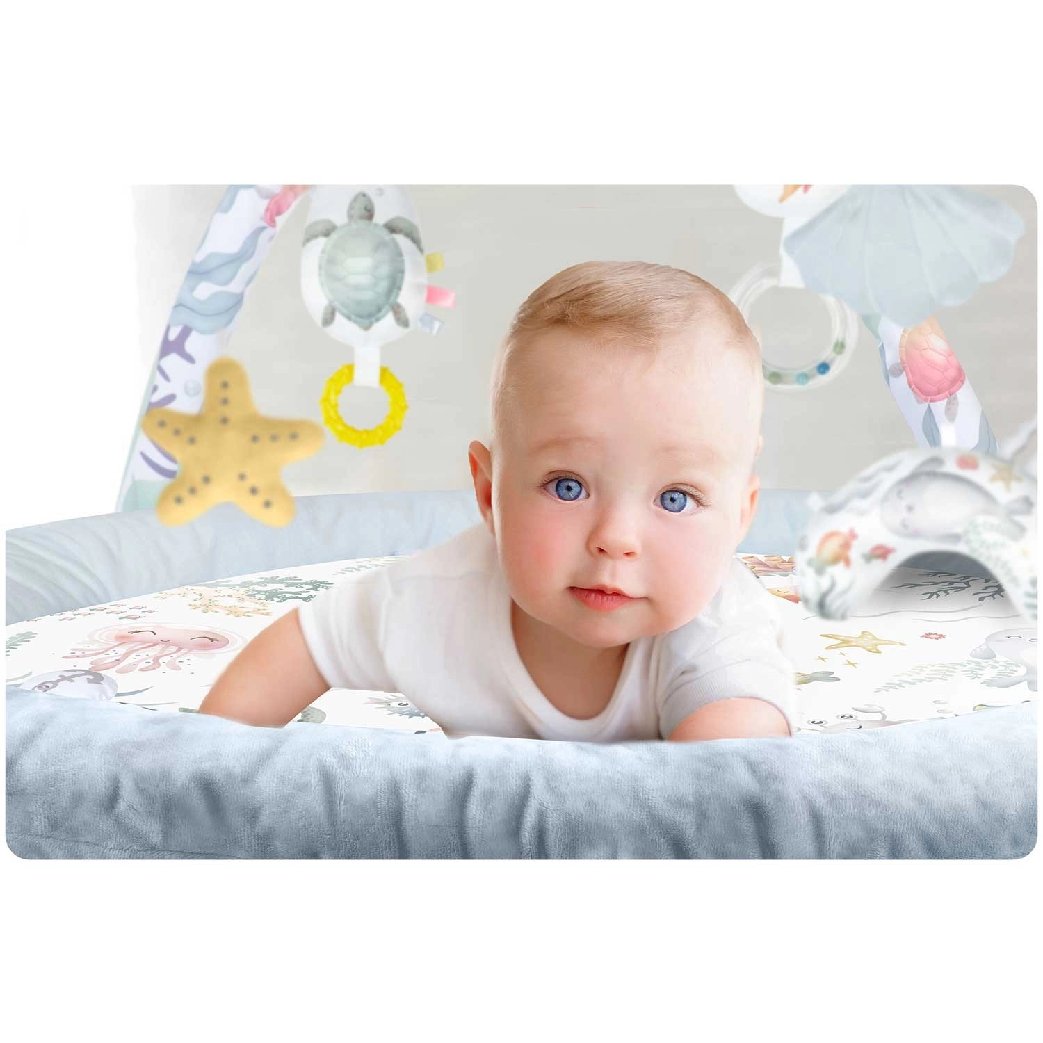 Legetæppet Nukido Ocean skaber et hyggeligt og sikkert miljø for både nyfødte og større babyer. To krydsede buer bærer aftageligt legetøj, der udvikler syn, berøring og hørelse – fra spejl til selvgenkendelse over rangler til knitreelementer og en pivelydende krabbe. Der medfølger også en blød pude for behagelig leg på maven.