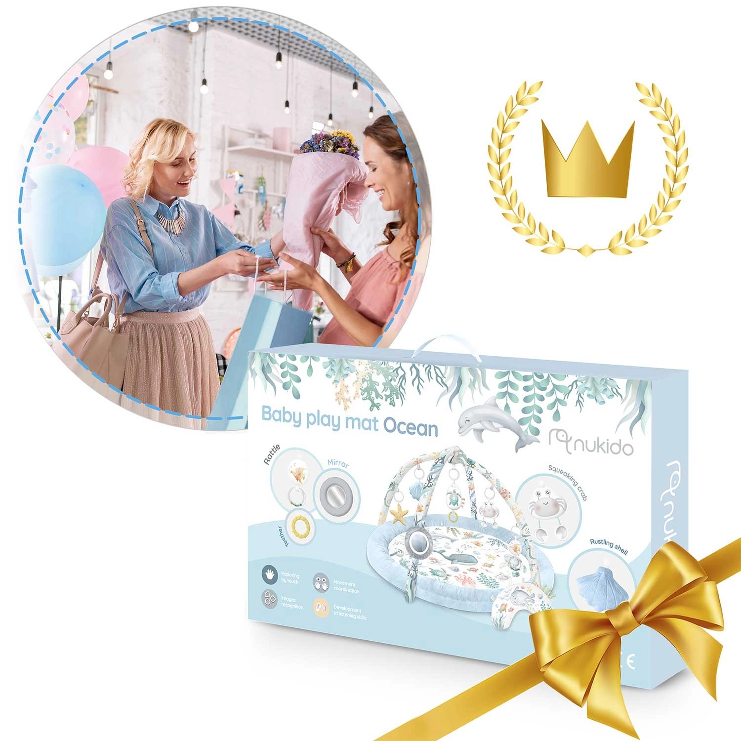 Det interaktive legetæppe Nukido Ocean giver børn et sikkert og behageligt sted til leg og hvile. Det indeholder 2 aftagelige buer, 7 multifunktionelle legetøj inklusive spejl, rangler og pivelyd, samt en blød pude til mave-tid. Det er let at folde sammen, har en blød, let rengørbar overflade og stimulerende oceanfarver, der understøtter barnets sanse- og motoriske udvikling.