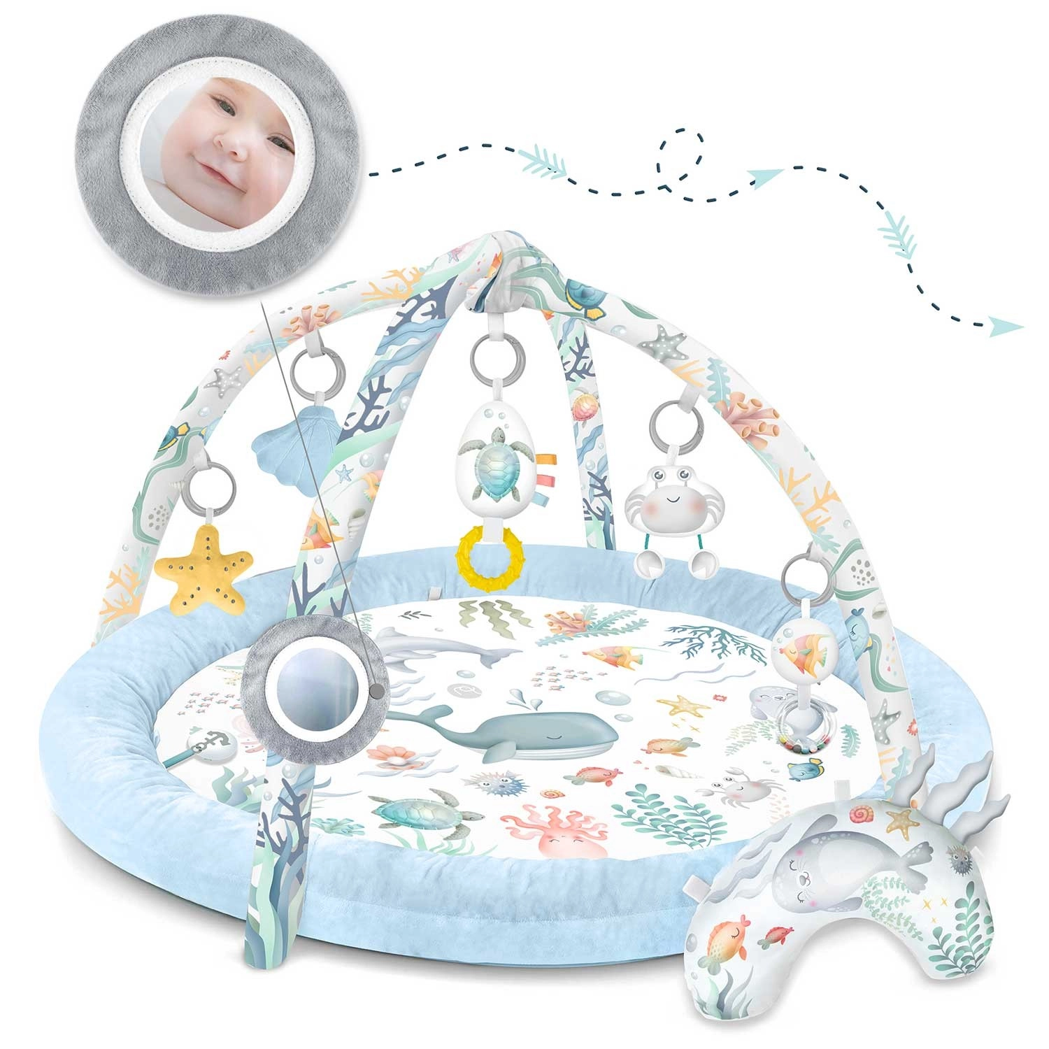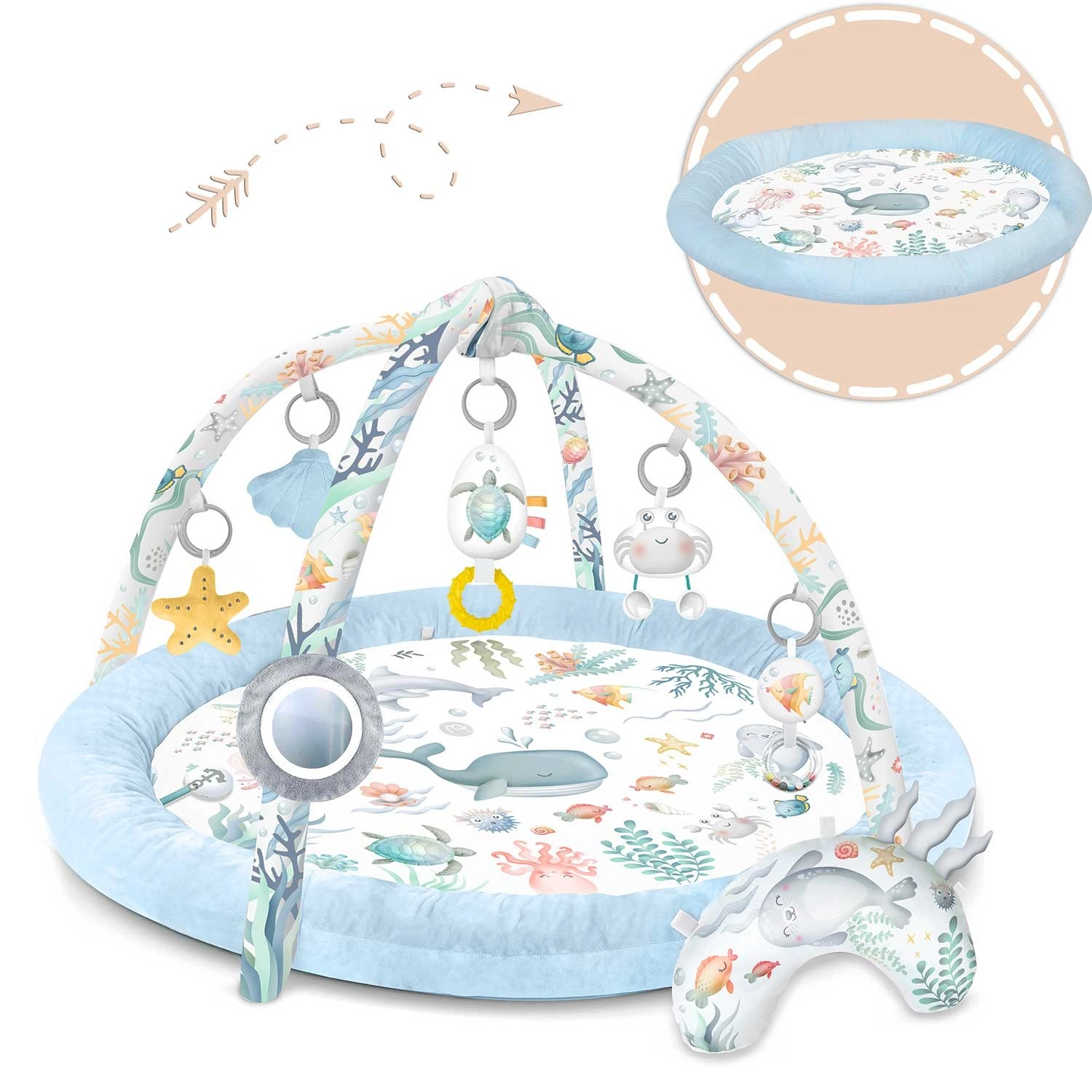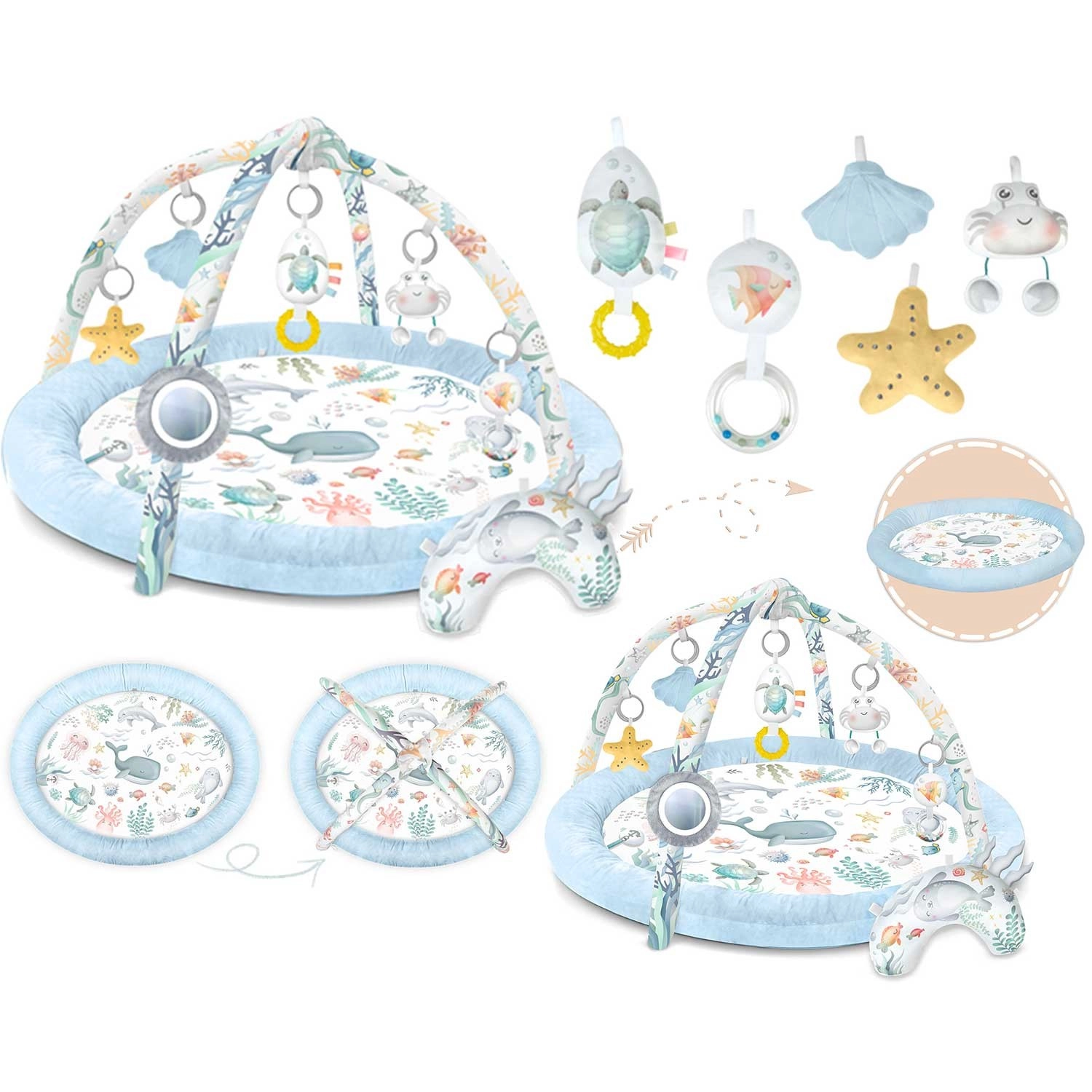 - Legetæppe med forhøjet kant, 2 aftagelige buer, 7 multifunktionelle legetøj, pude