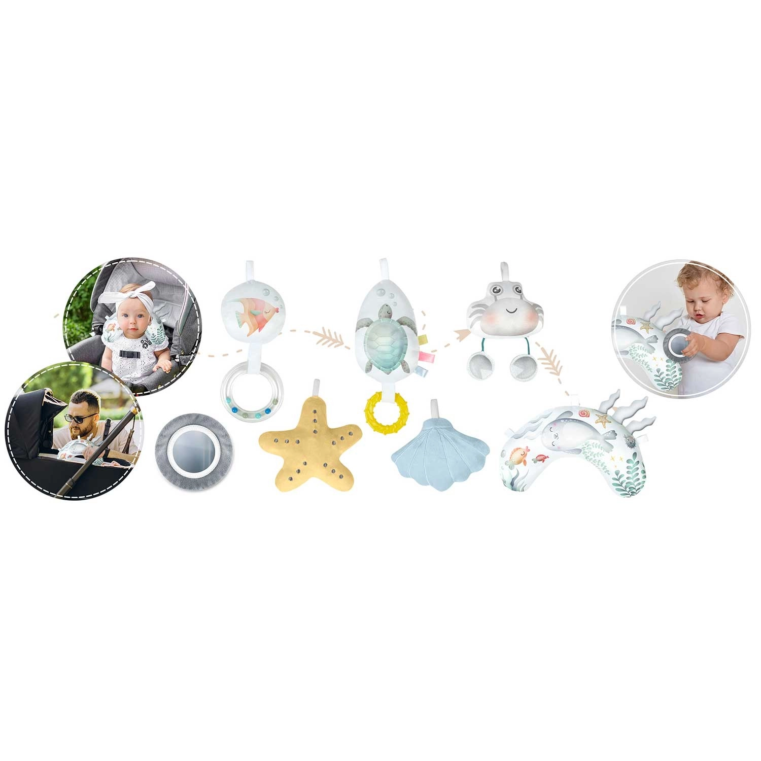 Spejl, rangler, bløde plysdyr og en pivelydende krabbe stimulerer syn, hørelse og berøring. Legetøjet kan flyttes frit på buerne og langs kanterne.