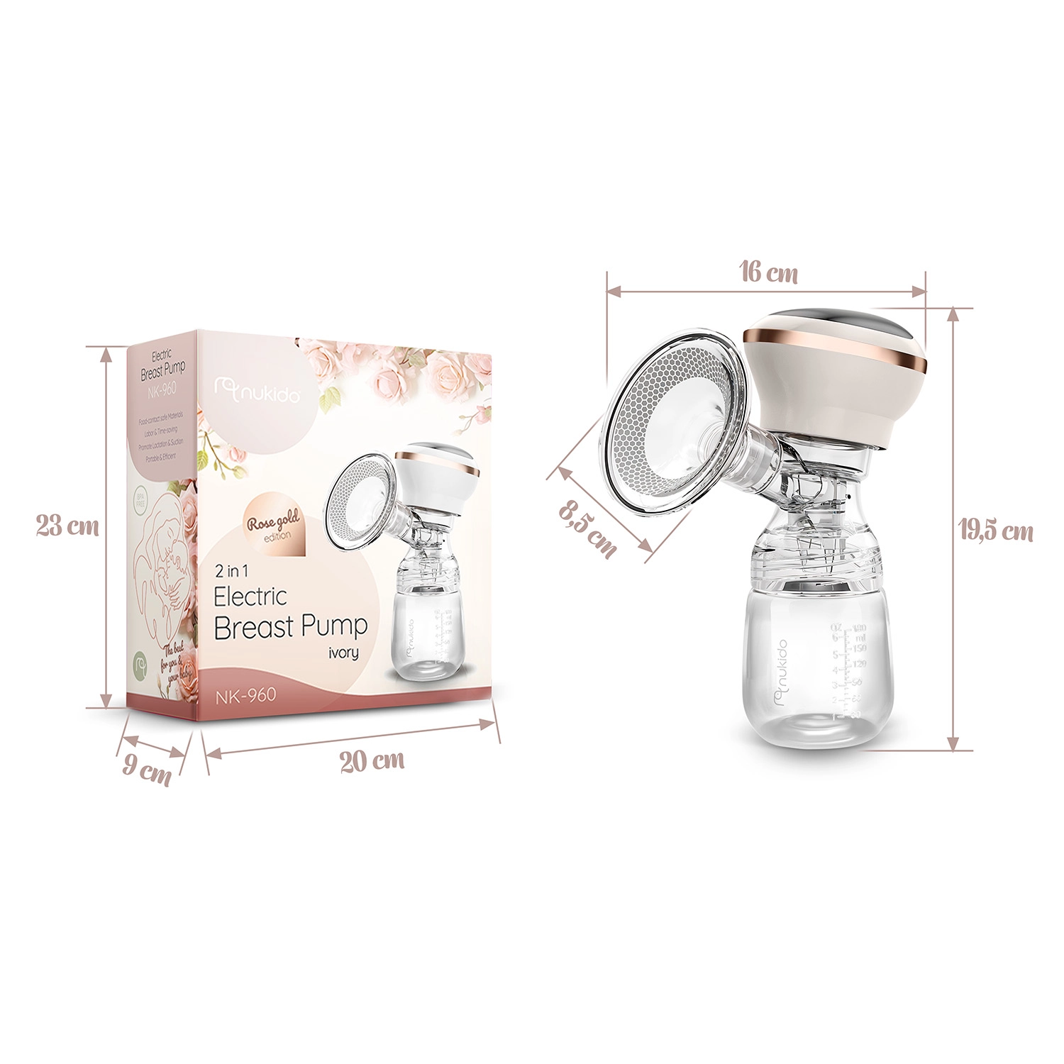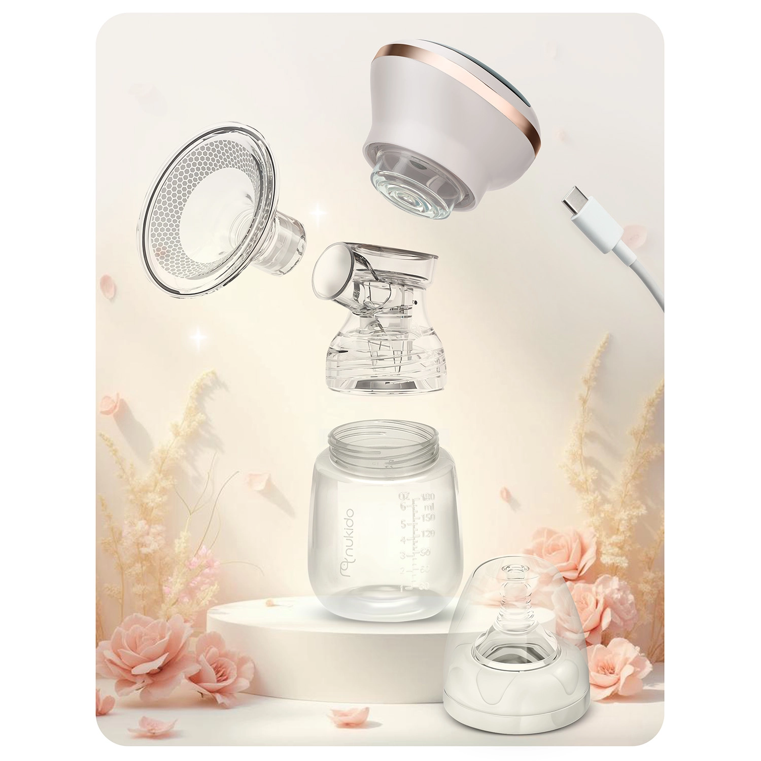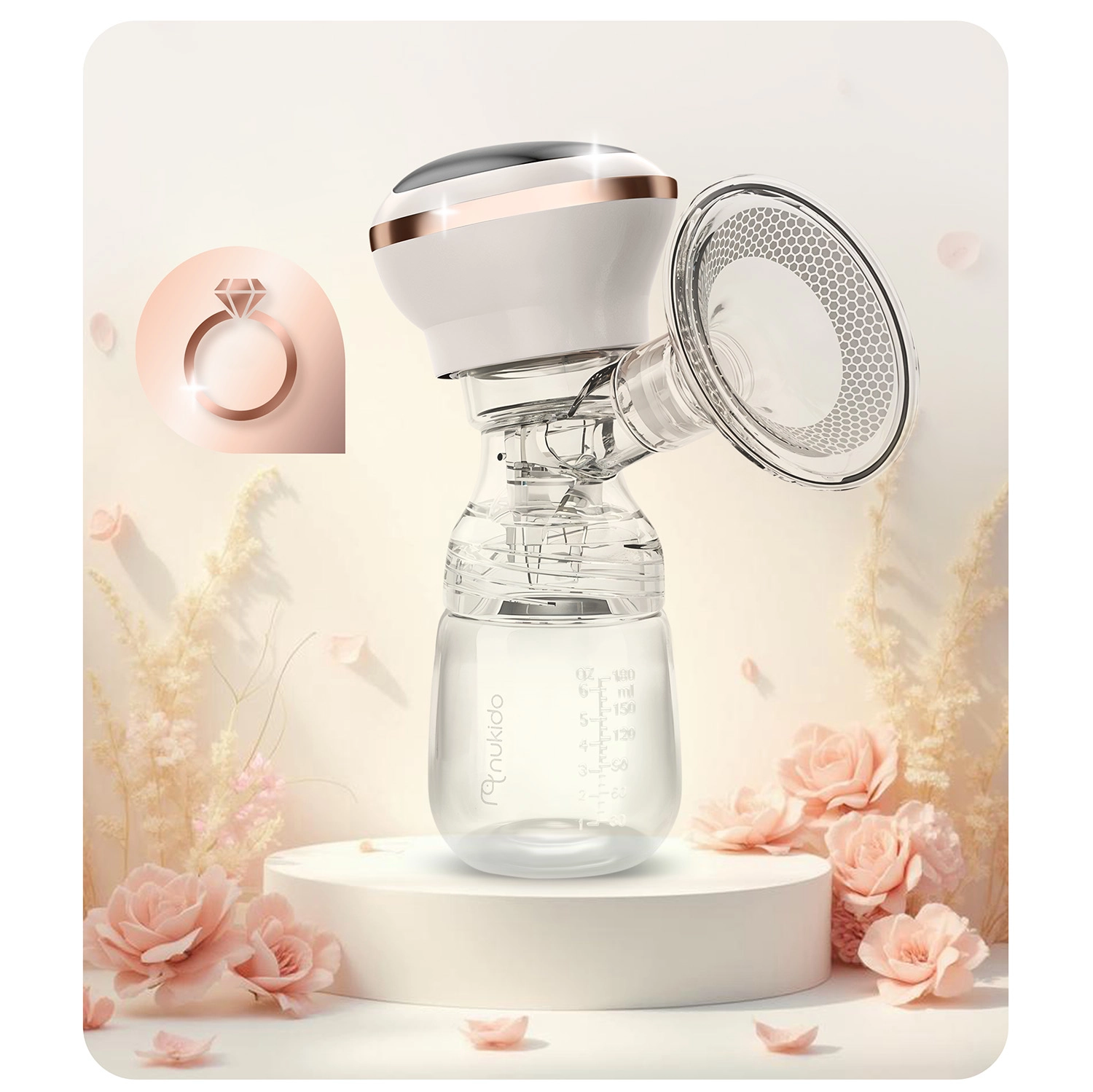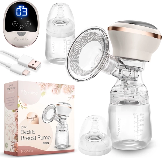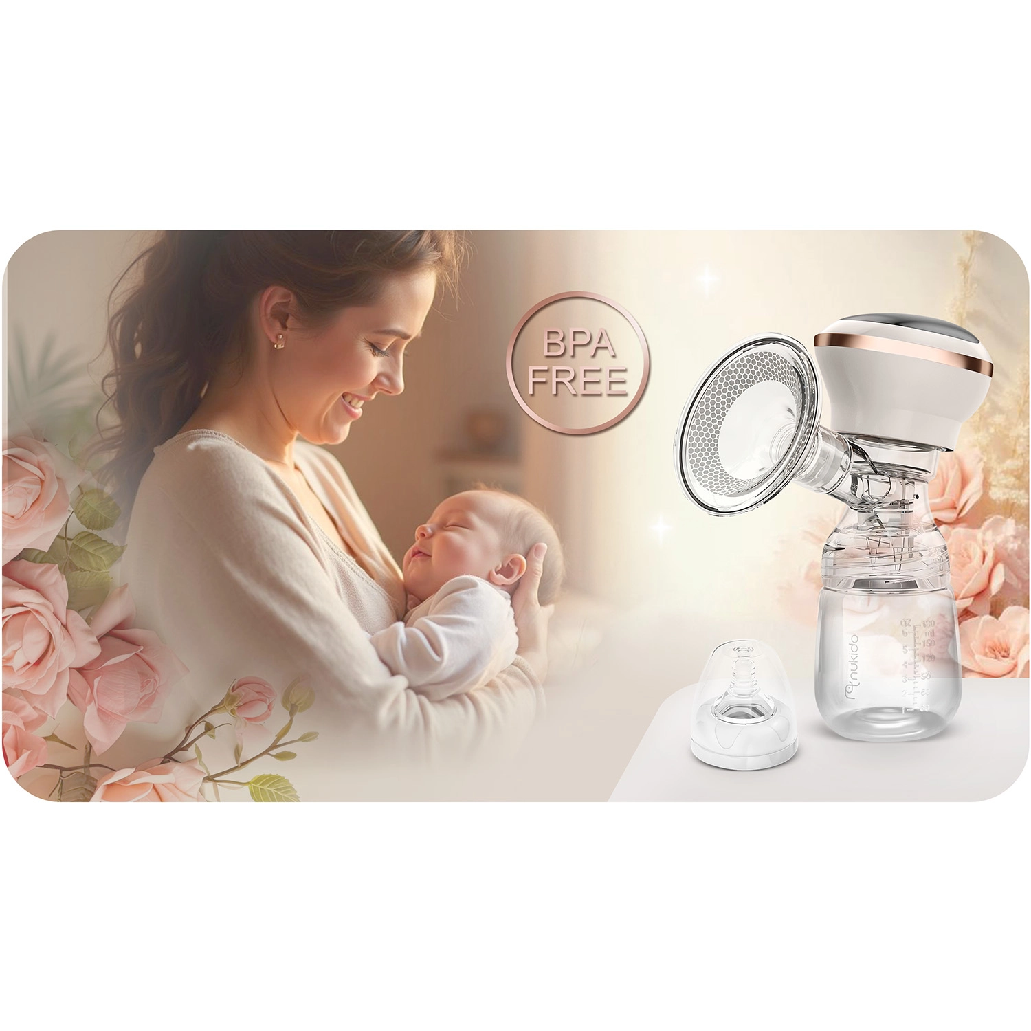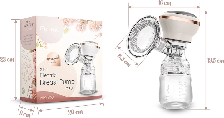 Den kompakte og stille elektriske brystpumpe fra Nukido tilbyder 3 sugefaser, op til 9 niveauer af stimulering, LED‑display med touch‑betjening og trådløs brug takket være et integreret lithiumbatteri. Medfølger gør en 180 ml flaske med dynamisk sut, en blød silikone‑massageindsats for komfort samt opladning via USB‑C. Materialerne er BPA‑fri, og delene (undtagen det elektriske panel) kan vaskes i opvaskemaskinen.