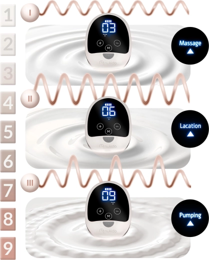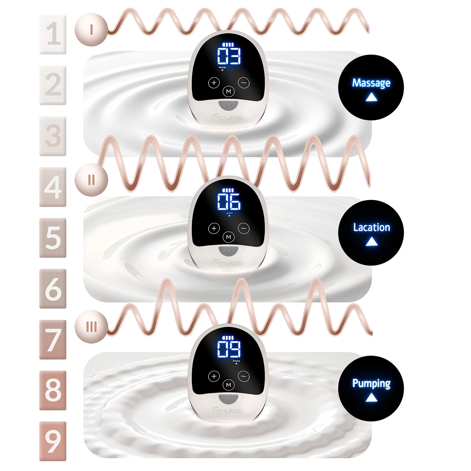 Nukido‑pumpen efterligner troværdigt babyens naturlige sutterytme for effektiv og skånsom udpumpning af mælk. Tre tilstande (stimulering, sug, dyb udpumpning) og 9 justerbare niveauer lader dig tilpasse effekten til dine behov uden ubehag. Den massagende silikoneindsats med blid berøring understøtter nedløbsrefleksen og øger komforten selv ved længere brug.