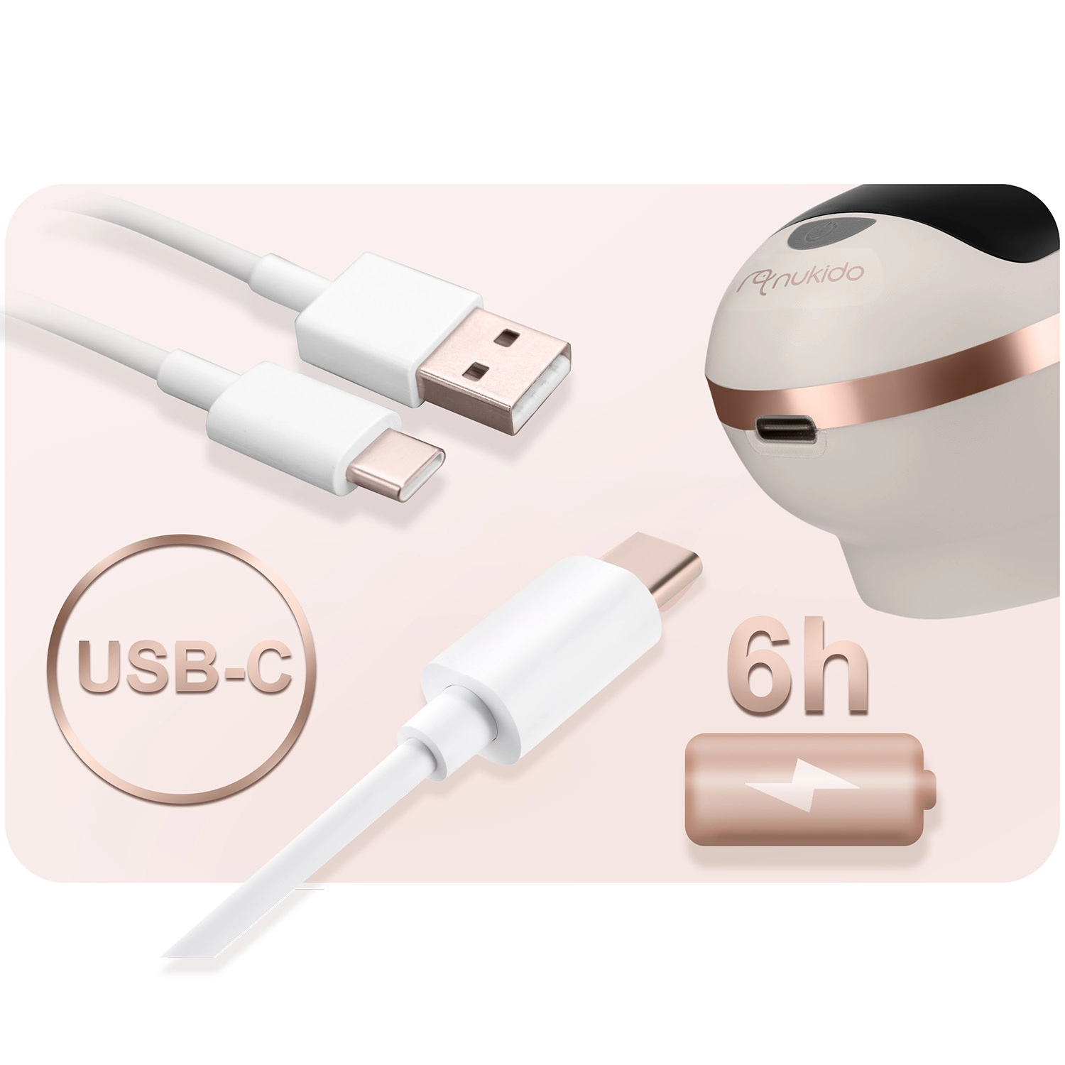 Massagekappe med støvlåg, motorenhed med LED, silikonemembran, ventil, 180 ml flaske, dynamisk sut med låg, USB‑C‑kabel med adapter