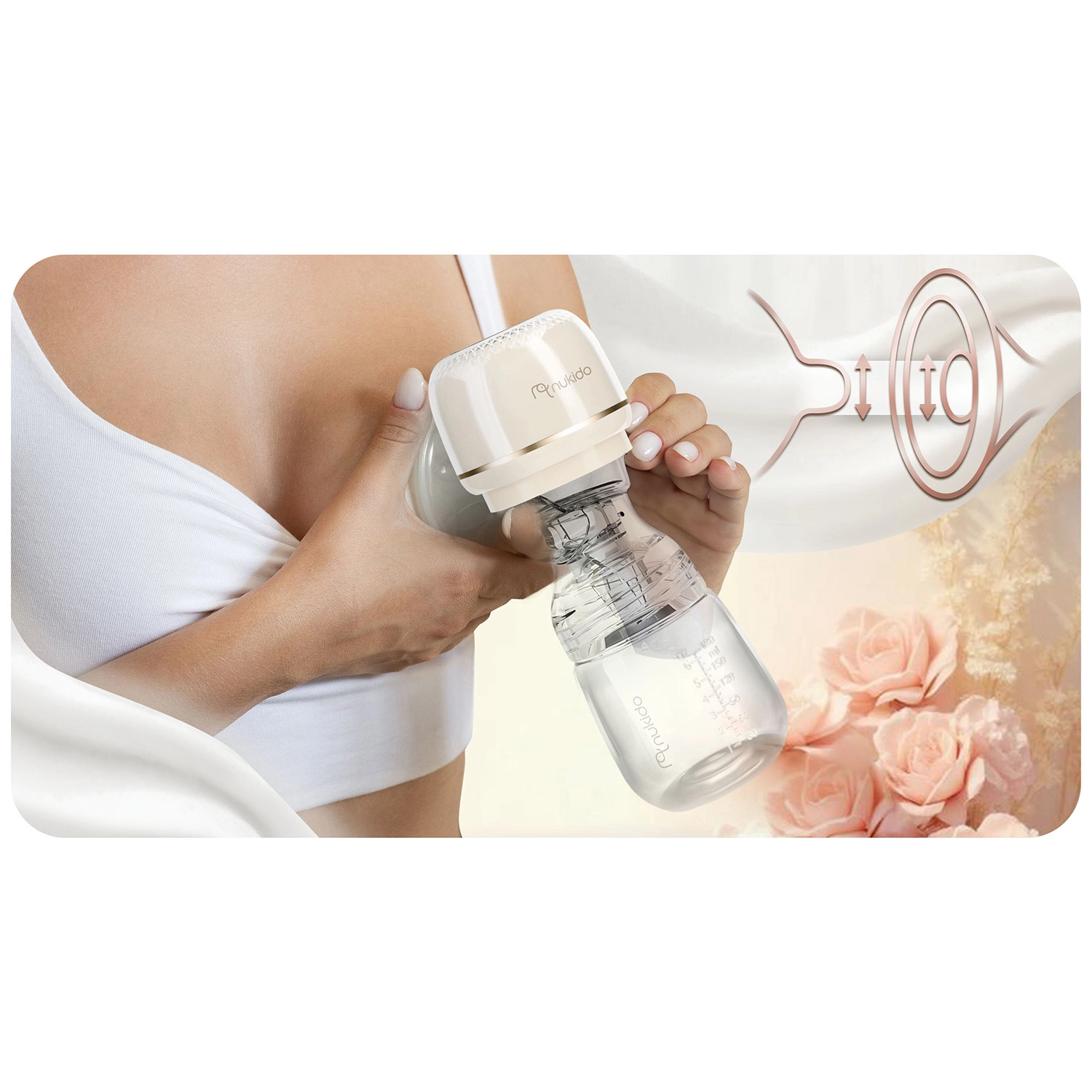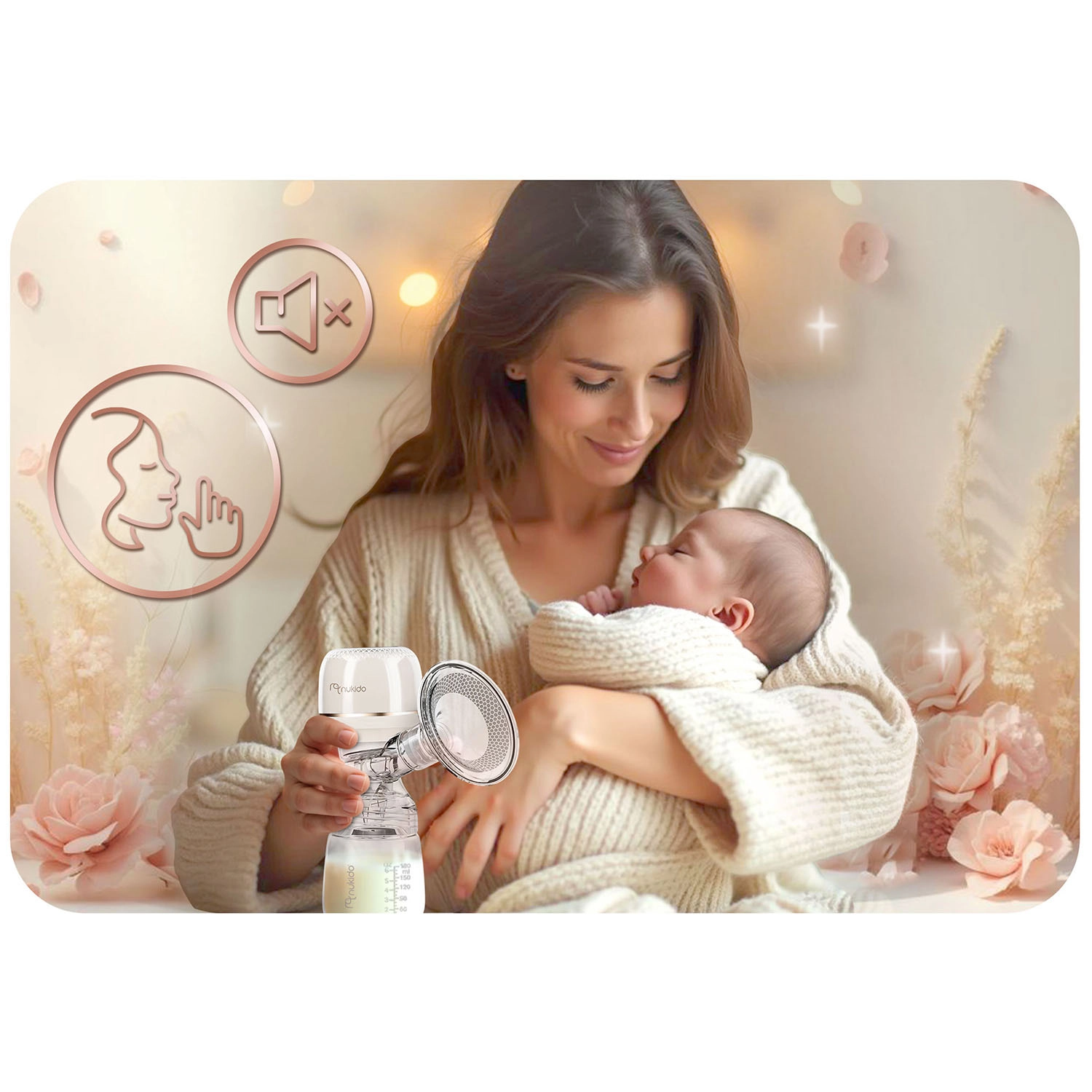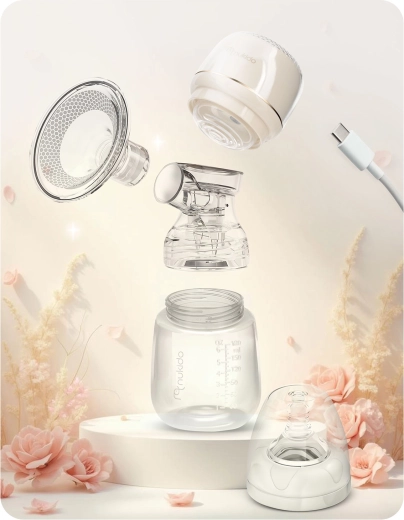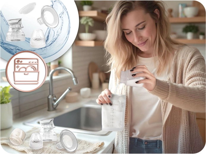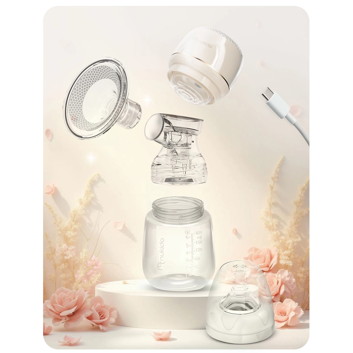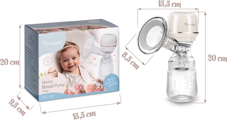 Der medfølger en 180 ml flaske med dynamisk sut, der i formen minder om moderbrystet og understøtter korrekt sutteteknik, så laktationen ikke forstyrres. De fleste dele kan gå i opvaskemaskinen (undtagen det elektriske panel), og de anvendte materialer er antibakterielle og uden BPA. De kompakte mål og den stille drift gør denne pumpe ideel til hjemmet, arbejdet og rejser.