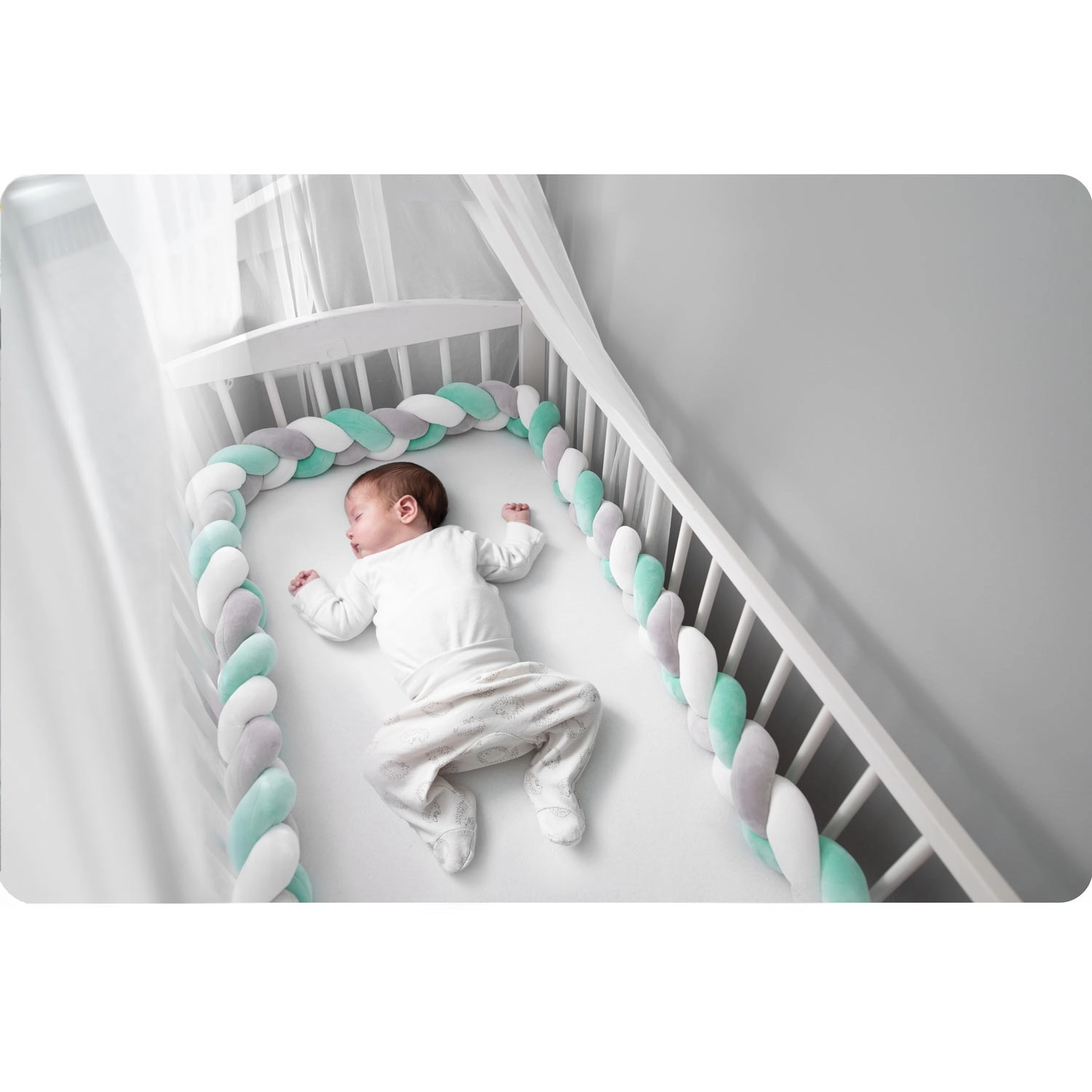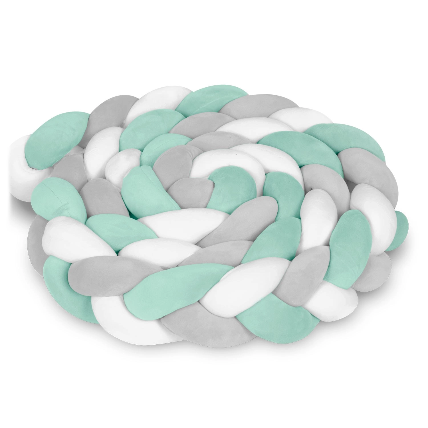 Den flettede sengebeskytter til tremmeseng i en moderne mint–grå farvekombination skaber en blød, sikker barriere langs sengens kanter. Takket være det behagelige, hypoallergene materiale uden skarpe elementer er den skånsom mod barnets hud og egnet allerede fra nyfødt. Tæt quiltning og en luftig fyldning dæmper stød og udfylder mellemrummene mellem tremmerne.