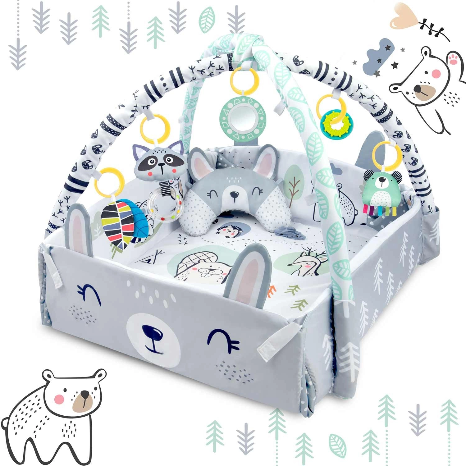 Inkluderer 7 originale legetøj herunder spejl, rangler, knitreelementer og pivelyd samt en sensorisk båndlegeting. Både legetøj og polstrede buer kan let flyttes eller fjernes. Mavepuden til tummy time med blød minky-side støtter korrekt positionering og styrker nakke- og rygmuskler.