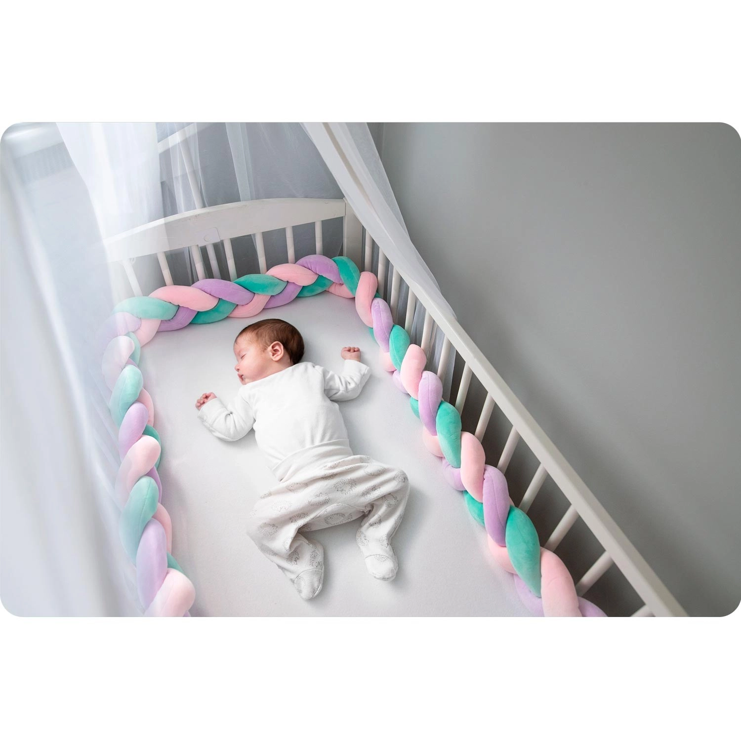 Den flettede sengekant fra Ricokids skaber et blødt og hyggeligt miljø for babyen. De kraftige flettede strenge dæmper stød mod tremmerne, forhindrer, at små hænder kiler sig fast, og sikrer en roligere søvn. Takket være kombinationen af mint, lyserød og lilla bliver den et stilfuldt tilbehør til enhver tremmeseng og ethvert børneværelse.