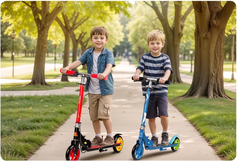 Store PU-gummihjul med en diameter på 145 mm dæmper ujævnheder effektivt, og i kombination med præcise ABEC-7 lejer leverer de glat, hurtig og stille kørsel på fortove og cykelstier. Det dobbelte bremsesystem – håndbremsegreb og bageste fodbremse – giver børn bedre kontrol over hastigheden og sikker standsning.