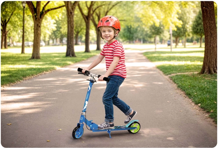 Let og robust scooter til børn 3–8 år med stilfuldt rumdesign tilbyder sammenklappelig konstruktion, justerbart styr, store PU-hjul 145 mm og dobbelt sikker bremsning – hånd- og fodbremse. ABEC-7 lejer sikrer en glat og lydsvag kørsel, mens den brede skridsikre fodplade og en solid ramme med EN 71-certificering giver stabilitet.