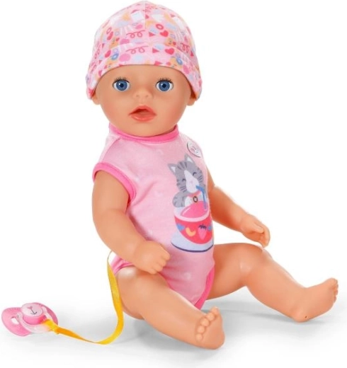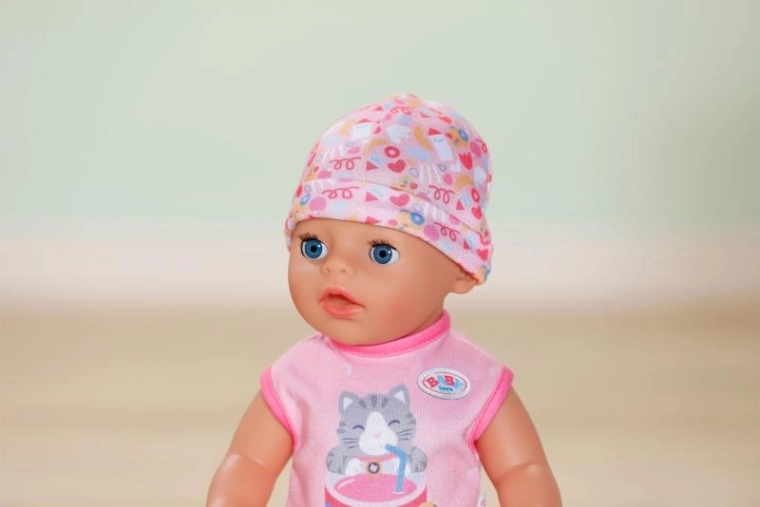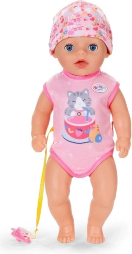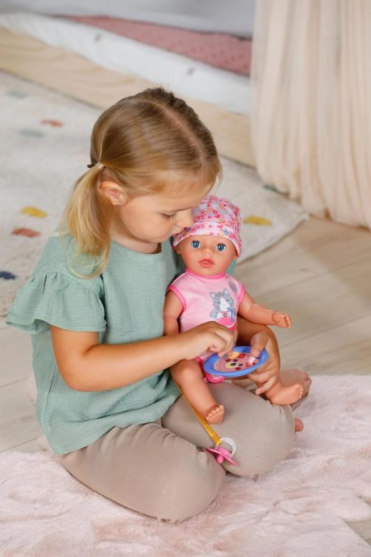 Sutten, der er fastgjort til sparkedragten med et sødt kattemotiv, gør det muligt for dukken at åbne og lukke øjnene også når hun sidder. Når hun lægges i sengen, lukker hun øjnene selv, som om hun virkelig sover. Bevægelige arme og ben samt et drejeligt hoved gør påklædning og afklædning let, så små omsorgspersoner kan klare det hele selv.