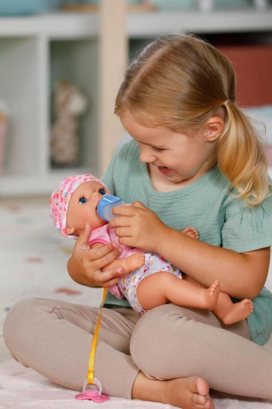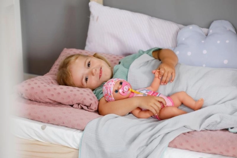 Dukken åbner og lukker øjnene ved hjælp af den medfølgende sut og lukker dem selv, når hun lægges i sengen. En skøn effekt til beroligende putteritualer.