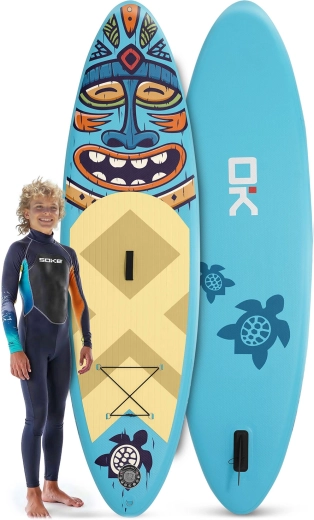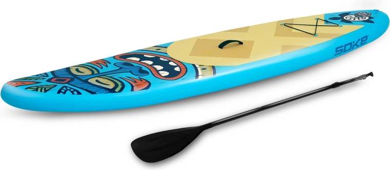 Opdag det lette og stabile oppustelige paddleboard Soke til børn, teenagere og lettere voksne. Det komplette sæt indeholder alt, hvad du behøver: justerbar pagaj, dobbelthandlingspumpe med manometer, sikkerhedsleash, aftagelig finne, støttesæde, reparationssæt og robust rygsæk. Den skridsikre EVA-måtte, drop-stitch konstruktion og forreste bungee-system til nem transport af udstyr sikrer både sjov og tryghed på vandet.