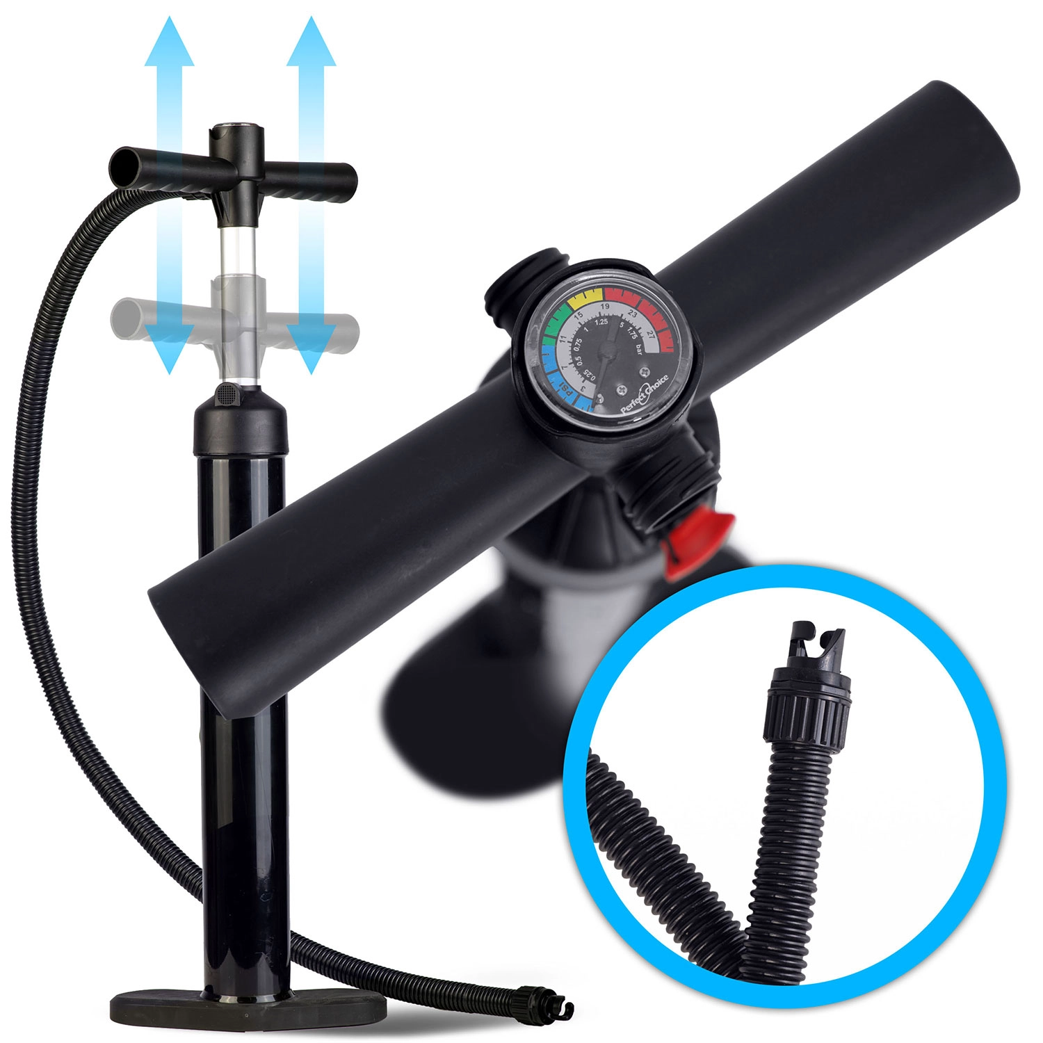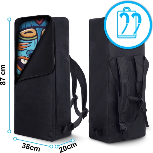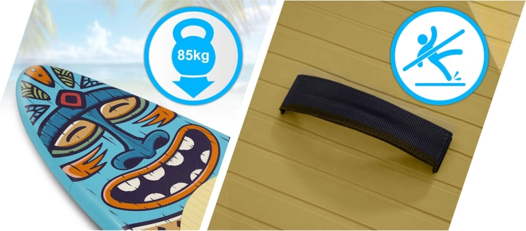 Den robuste drop-stitch light-konstruktion med flerlags PVC og UV-beskyttelse garanterer lang holdbarhed. En dobbelthandlingspumpe med manometer gør oppumpningen hurtig og minimerer risikoen for overpumpning. Den justerbare aluminiumpagaj (162–210 cm) tilpasses nemt din højde og kørestil, mens den spiralformede leash med drejeled forhindrer sammenfiltring og øger sikkerheden.