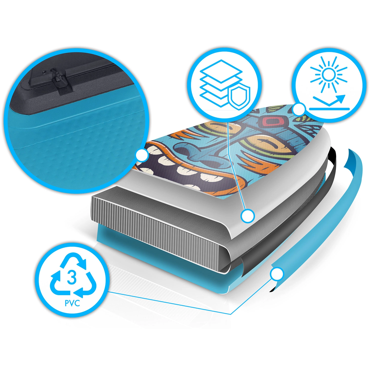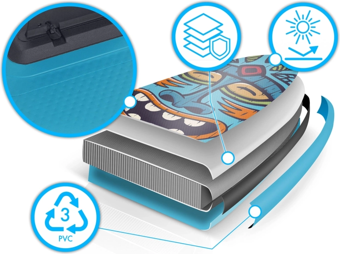 Flerlags PVC med drop-stitch light-teknologi giver lav vægt, høj stivhed og lang levetid – selv ved hyppig brug i solen.