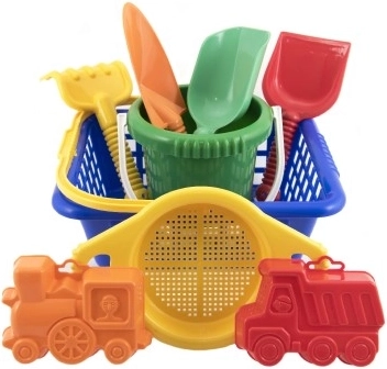I pakken finder du spand, skovl, spade, rive, si og 2 sandforme. Børn kan grave, si, øse og forme figurer og udfolde kreativiteten fuldt ud i sandlegen.