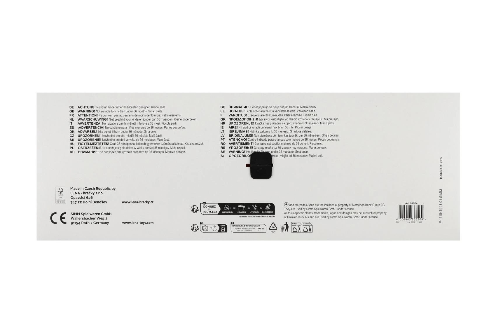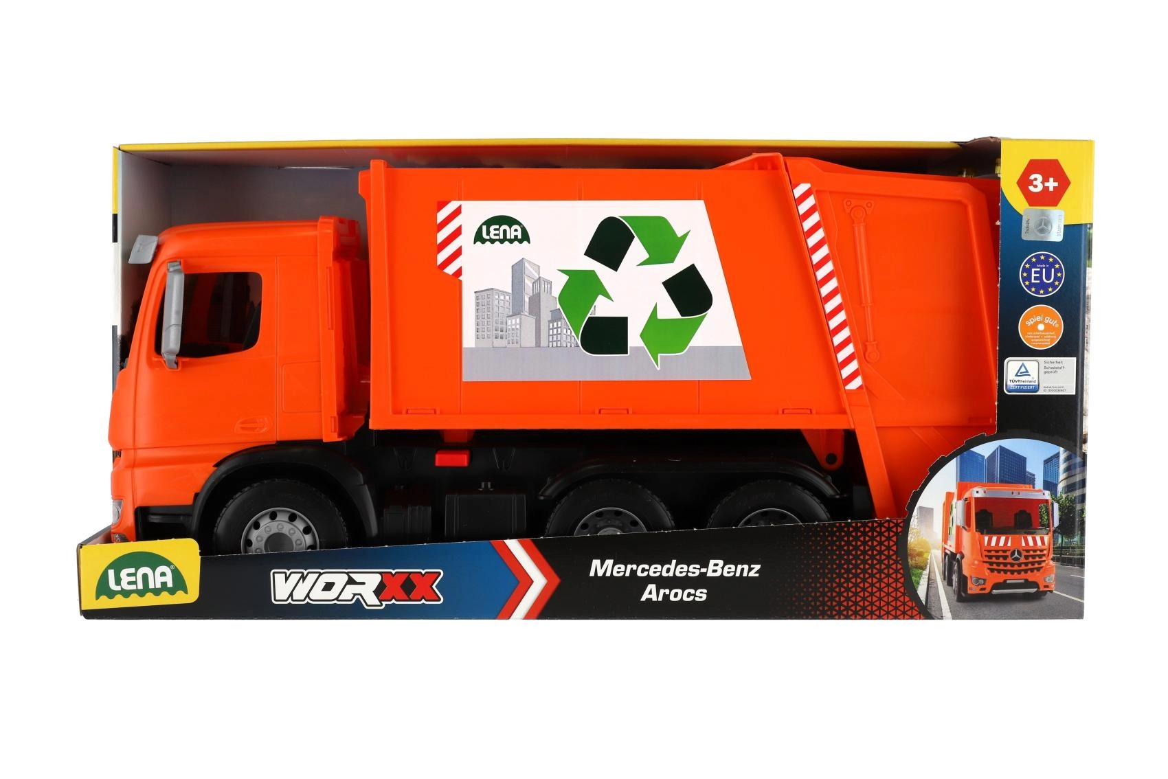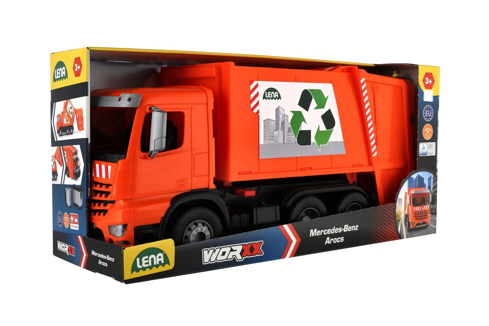 Skraldebilen MERCEDES AROCS fra LENA er et detaljeret køretøj til små teknikentusiaster. Takket være den robuste udførelse i kvalitets, holdbar plast og de stærke metalaksler klarer den daglig leg inde såvel som ude. Den funktionelle bagdel med sikring gør sikker pålæsning og tømning mulig.