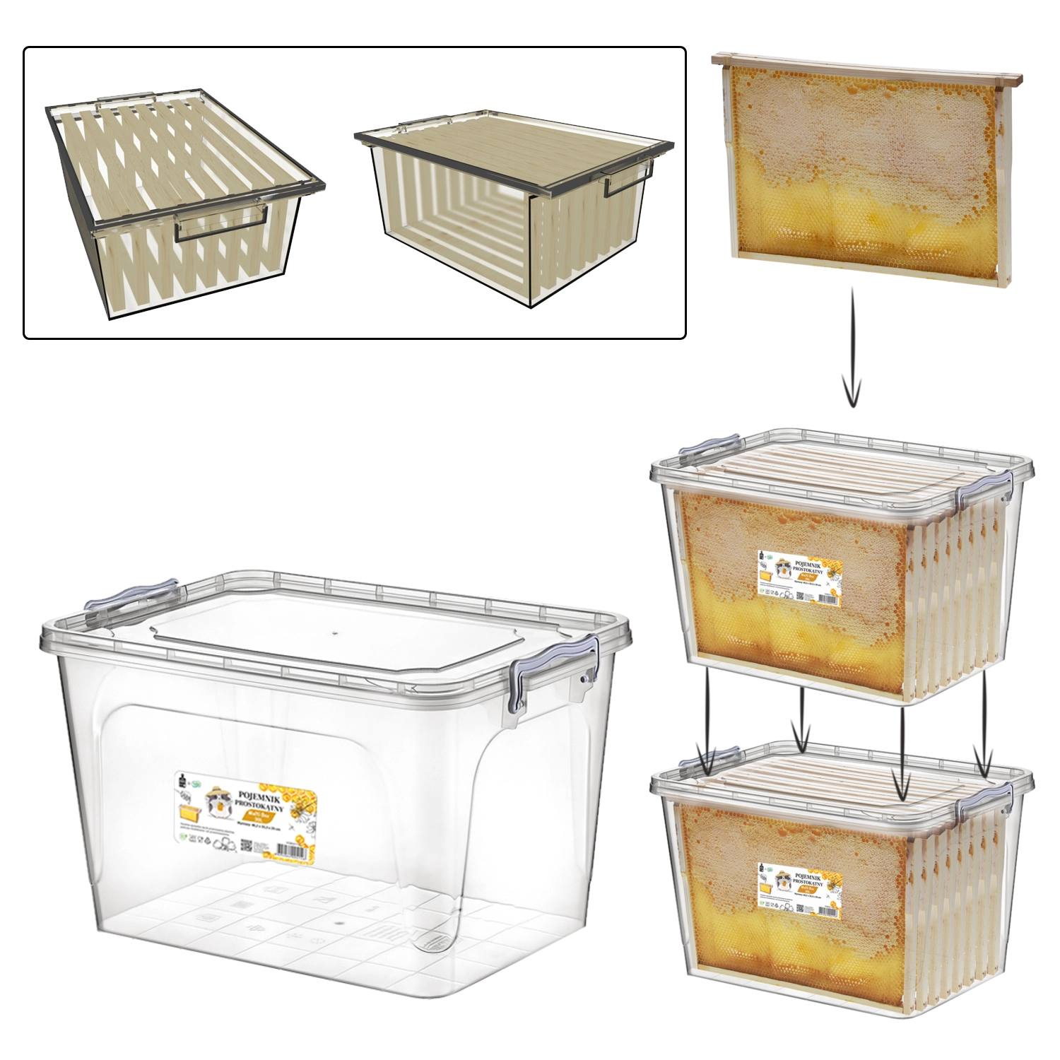 Praktisk og holdbar opbevaringsboks med volumen på 30 l til sikker opbevaring af biavlsrammer. Takket være de særlige indvendige fremspring rører rammerne ikke ved væggene, det tætsluttende låg beskytter mod skadedyr, og den gennemsigtige udformning gør det nemt at kontrollere indholdet. Boksen er stabelbar, har sidehåndtag for nem transport og rummer op til 8 rammer (Wielkopolska) eller 16 halve rammer (1/2).
