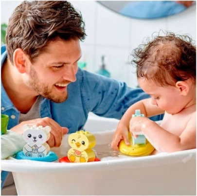 Gør hvert bad sikkert og stimulerende. De farverige dyr på pænt afrundede, flydende ringe kan nemt kobles sammen til et tog, trækkes hen over vandoverfladen og lave bobler. Delene er designet til små hænder, og fordi ringene kan åbnes, er rengøringen hurtig og hygiejnisk.