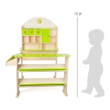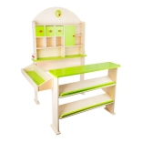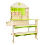 En moderne træbaseret salgsbod udvikler ikke kun børns kommunikations- og regnefærdigheder, men understøtter også deres kreativitet. Den er udstyret med opbevaringsrum, der inkluderer skrå hylder til kasser og separate hylder til modeller og varer. Bagvæggen indeholder hvileområder og skabe med funktionelle døre. På toppen af standen er der ure, som børn kan bruge til at lære tid og indstille åbningstider.