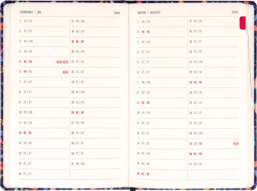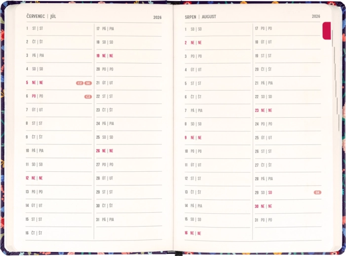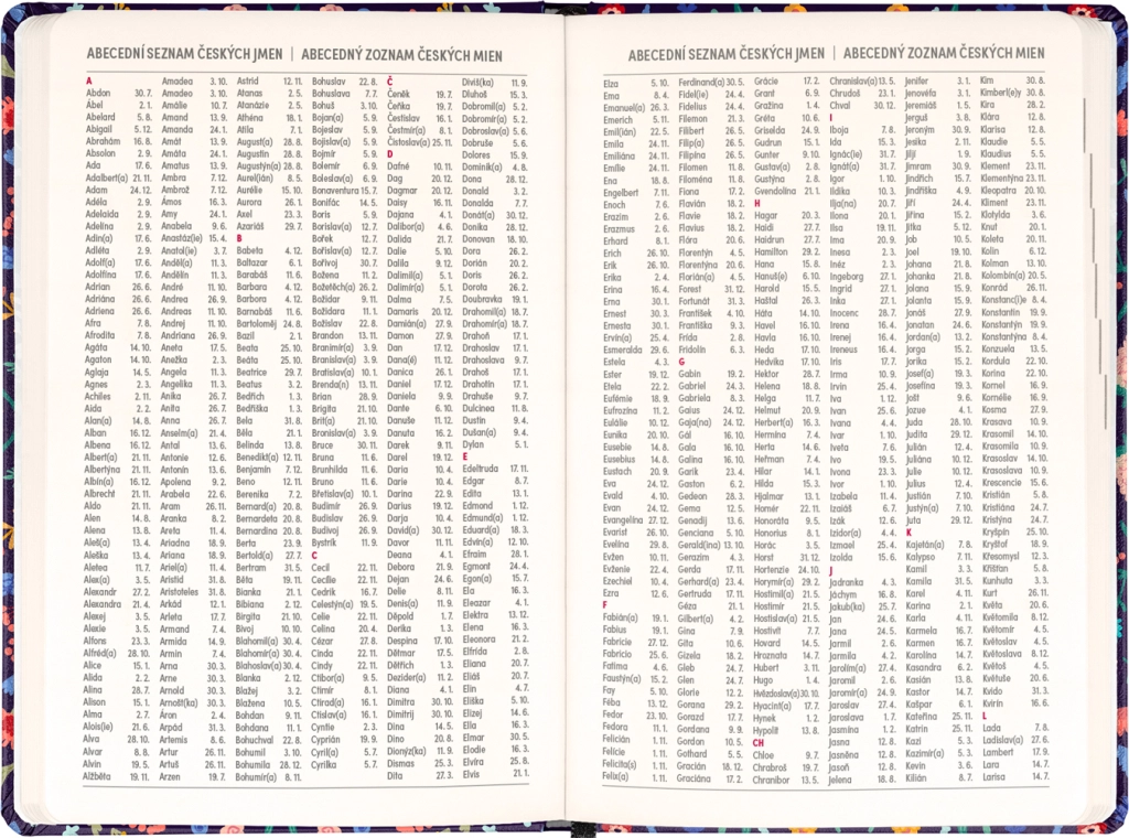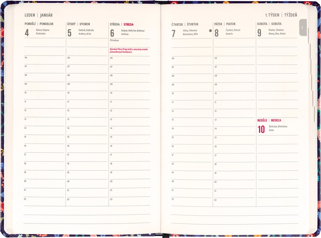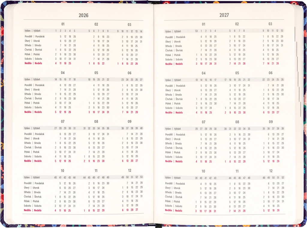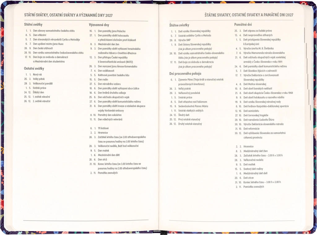 Den stilfulde Notique Petito Flora-kalender kombinerer praktisk ugedeling i søjler med et subtilt blomstermotiv. Takket være oversigter for 2026 og 2027 samt en liste over tjekkiske og slovakiske navne har du altid navnedage og planlægning lige ved hånden.