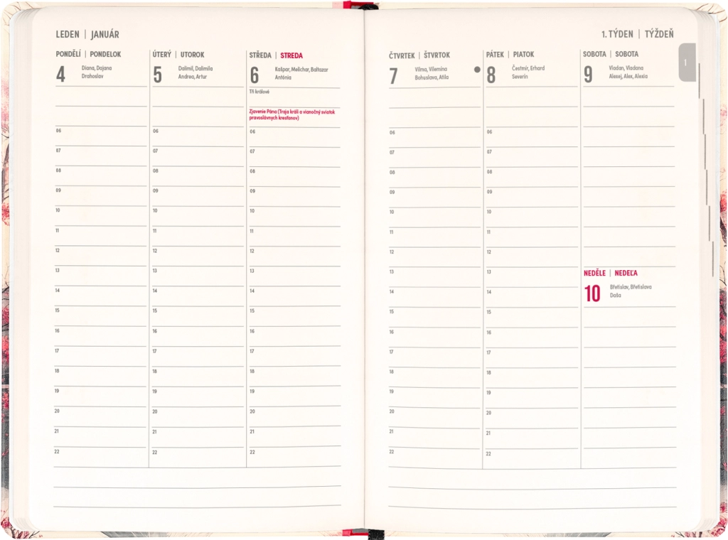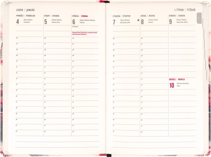 - ugentligt, kolonneopdelt, tjekkisk–slovakisk med navne og helligdage
