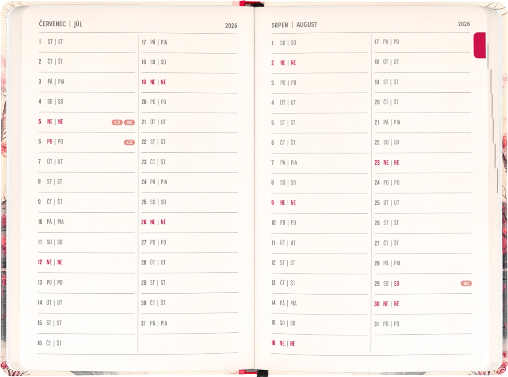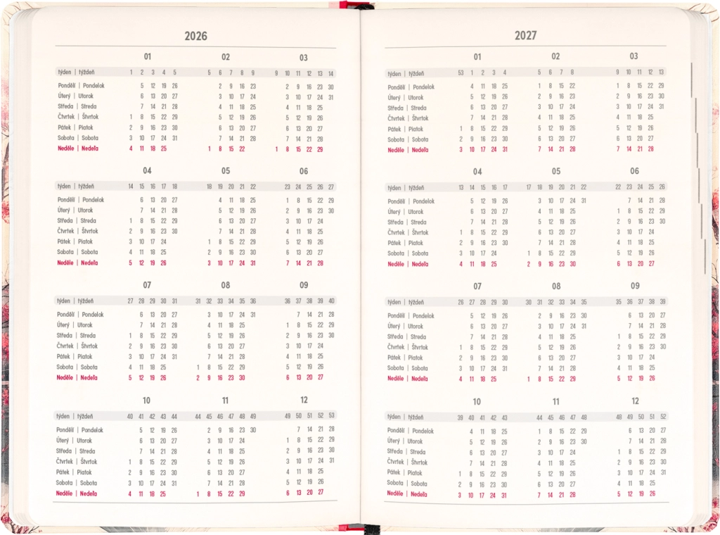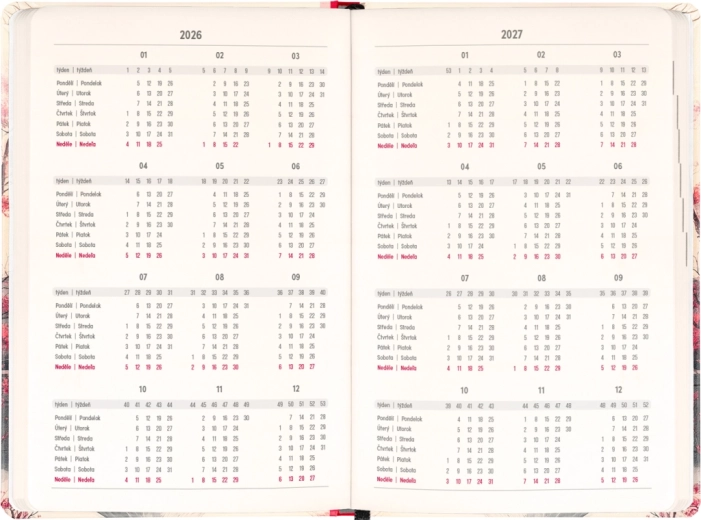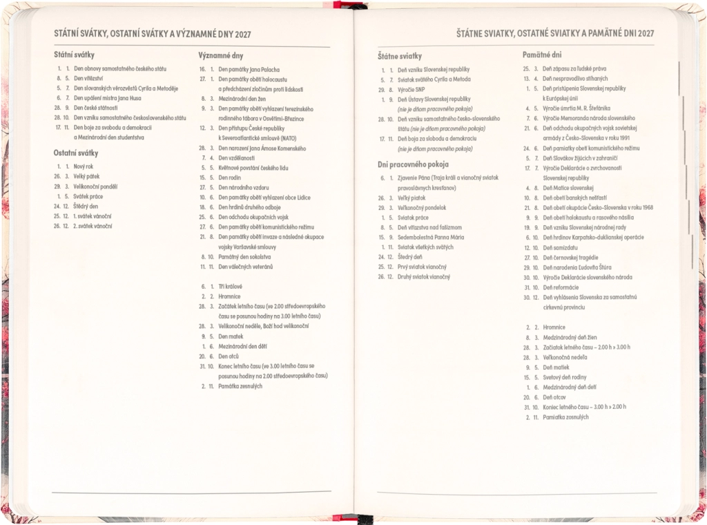 Kalenderen tænker på hverdagens planlægning såvel som højtider: du finder årsoversigt for 2026 og 2027, liste over tjekkiske og slovakiske navne og påmindelser om helligdage. Overskuelige kolonner for de enkelte dage gør det nemt at organisere arbejde, skole og fritid.