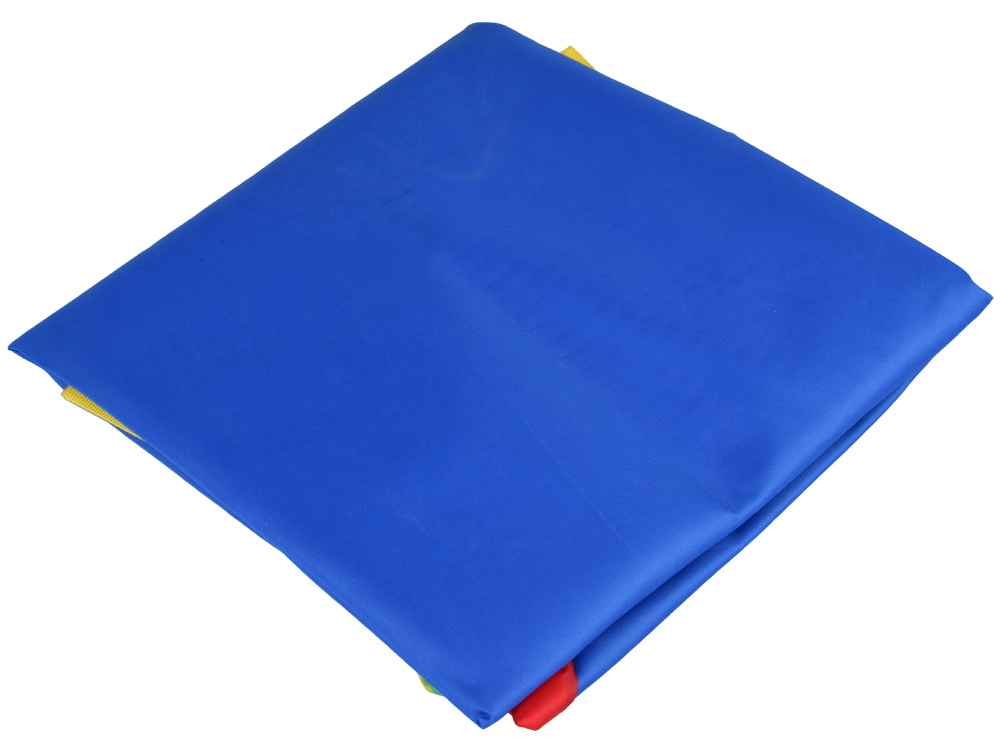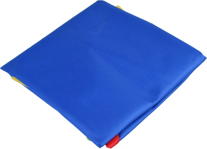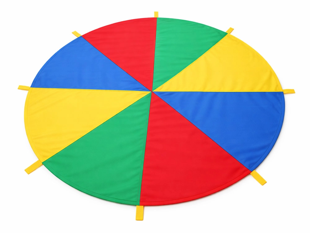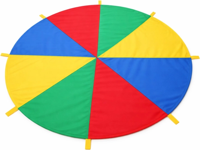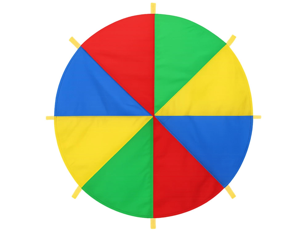 Det slidstærke tekstil i rød, blå, grøn og gul er forsynet med praktiske håndtag langs kanten for et fast greb. Faldskærmen er perfekt til aktiviteter som bølger, pladsskifte, opspring med bold eller farvelege – både inde og ude.