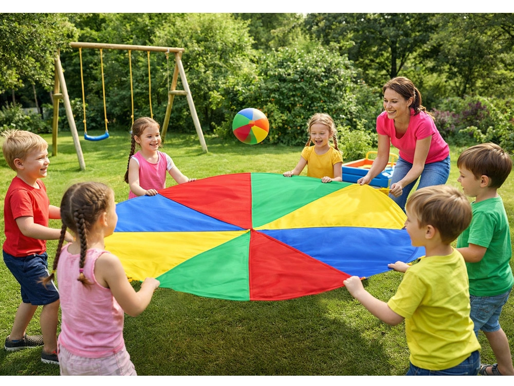 Aktive faldskærmslege styrker kommunikation, aftaler og gruppens fælles rytme. Børnene lærer at samarbejde og oplever glæden ved fælles succes.