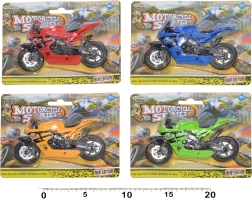 Lille, men hurtig! Denne racermotorcykel på 11 cm vil begejstre enhver hastighedsentusiast. Takket være friløbshjul kører den let og jævnt over gulvet og er ideel til børneløb og til hjemmets samling. Fås i 4 glade farver – blå, grøn, rød og gul.