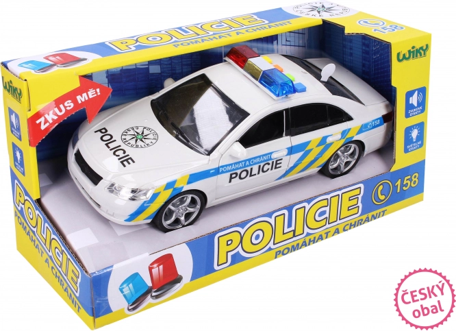 Politibil 24 cm med lys- og lydeffekter. Tjekkisk emballage, 3× AG13-batterier medfølger. Fantastisk gave til små politibetjente, klar til leg.