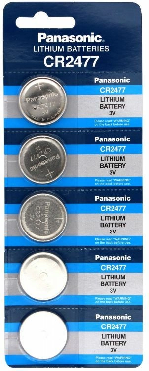 Pålideligt ikke-genopladeligt knapcellebatteri PANASONIC CR2477 med spænding på 3 V og høj kapacitet på 1000 mAh, ideelt til små elektroniske enheder som blodtryksmålere, termometre, fjernbetjeninger, lommeregnere, ure og kameraer. Den praktiske pakke med 5 stk. giver lang levetid og stabil ydeevne.