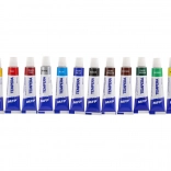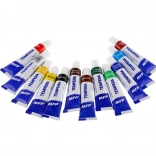 Sættet rummer et udvalg af 12 populære nuancer i 12 ml tuber: lys og mørk blå, lys og mørk grøn, lys og mørk gul, lys og mørk rød, lys og mørk brun, hvid og sort. Aluminiumstuberne med skruelåg giver præcis dosering og beskytter farven mod udtørring.