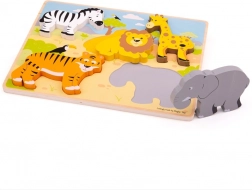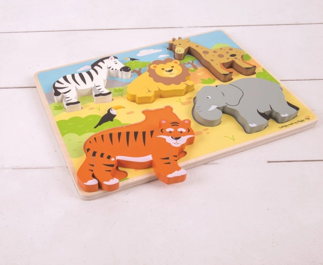 Fremstillet af kvalitetstræ fra ansvarlige kilder og designet til at opfylde aktuelle europæiske sikkerhedsstandarder. Puslespillet indeholder 5 store brikker med safarimotiver, som giver børn glæde ved at udforske og lære.