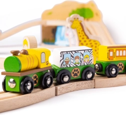 Udforsk safari-verdenen med en farverig og robust træ togbane, der glæder børn fra 3 år. Sættet inkluderer dyr som elefant, zebra og abe, træer, skilte og en bro, som den gule lokomotiv med to vogne kører over. Takket være magnetiske koblinger er legen intuitiv og kan nemt udvides.