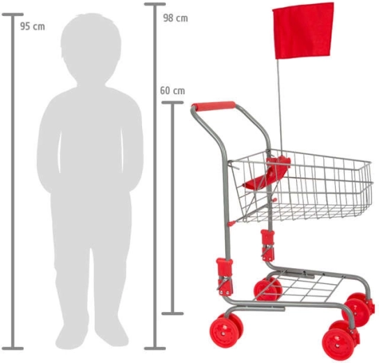 Den sølvfarvede børneindkøbsvogn SMALL FOOT i realistisk design imponerer med en stabil metalkonstruktion, røde accenter og en sikkerhedsflag. Takket være de drejelige forhjul er vognen let at manøvrere selv på små arealer, så børn komfortabelt kan “handle” som deres forældre.