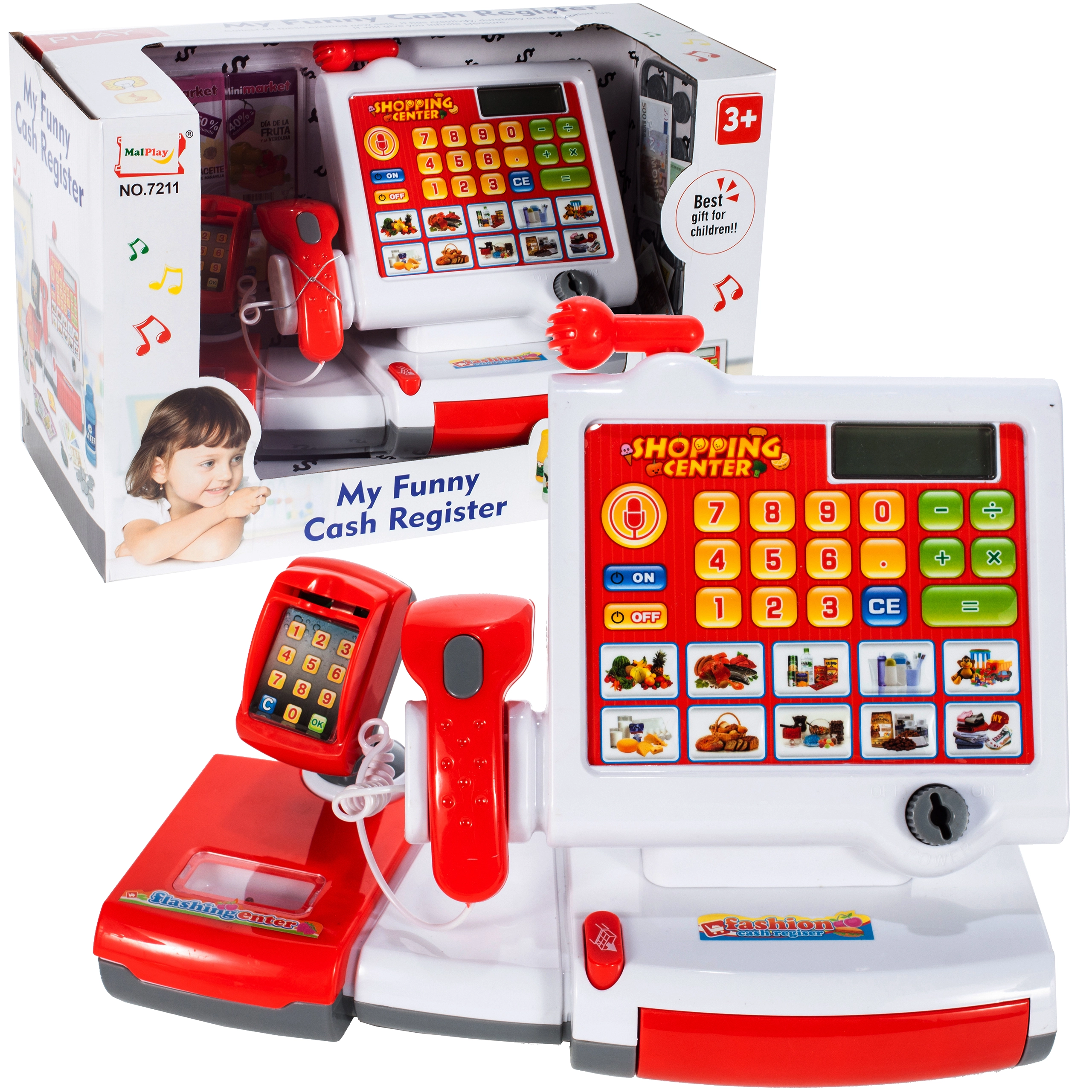 Sjovt kasseapparat til børn med berøringspanel, håndscanner og tilbehør til realistisk købmandsleg. Sættet indeholder fødevaremodeller og en attrap-mikrofon, der styrker kreativitet og sociale færdigheder. Ideelt til små ekspedienter og butiksassistenter.
