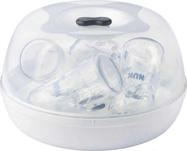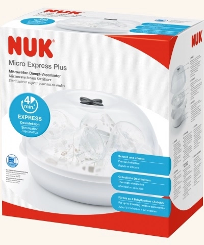 NUK Micro Express Plus er en dampsterilisator til mikrobølgeovn, som sørger for pålidelig desinfektion af sutteflasker og tilbehør på få minutter. Takket være den smarte holder rummer den op til 4 flasker á 300 ml med bred hals og holder dem i den rette position for effektiv tørring. Det gennemsigtige låg og det nye låsesystem sikrer sikker og overskuelig brug.