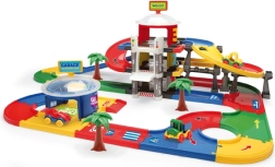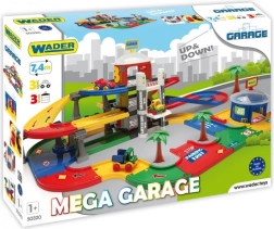 Mega-garagen fra Wader tilbyder børn fra 1 år mange timers kreativ leg. Tre etager forbundet med nedkørsler og kryds skaber en jævn 7,4 m lang rute, hvor børn kan øve kørsel, parkering og kapløb. De robuste plastdele i livlige farver er behagelige at røre ved og lette at holde rene.