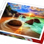 Puslespillet viser en malerisk udsigt over stranden med dramatisk solnedgang, havbølger og klipper.