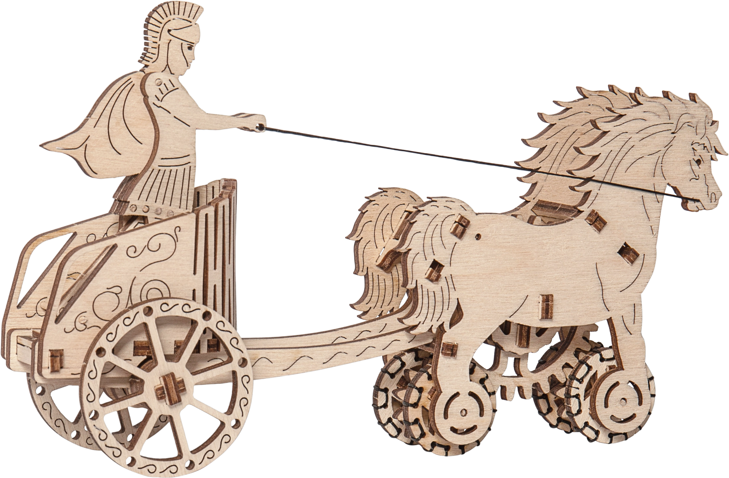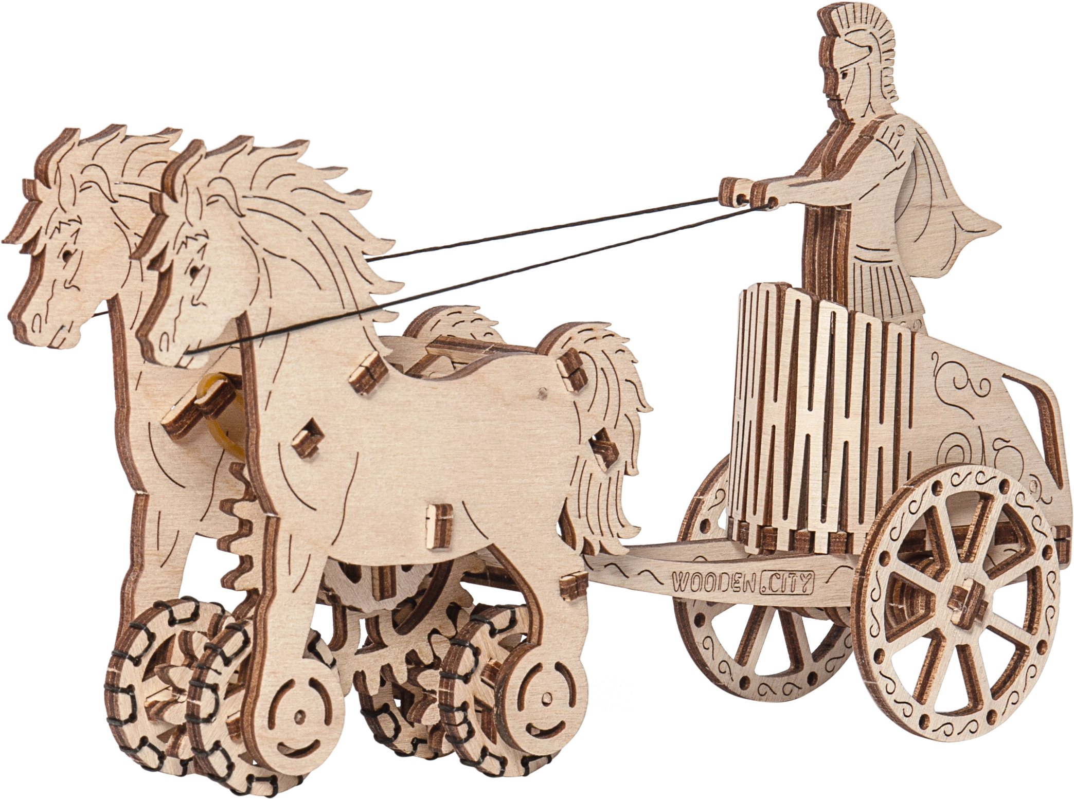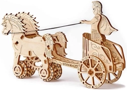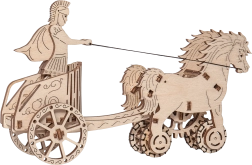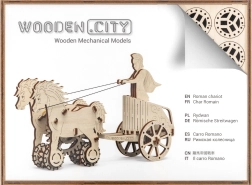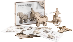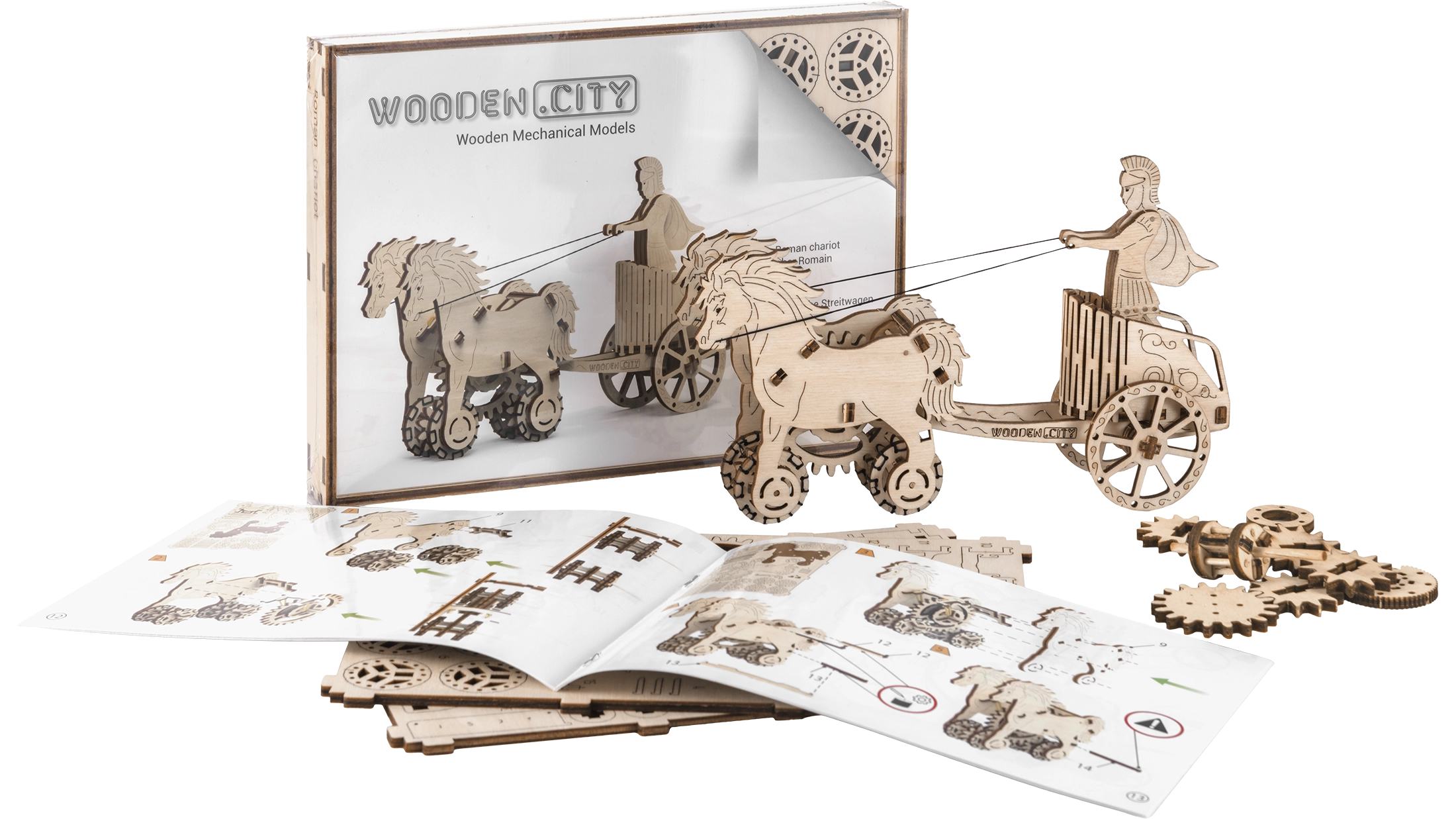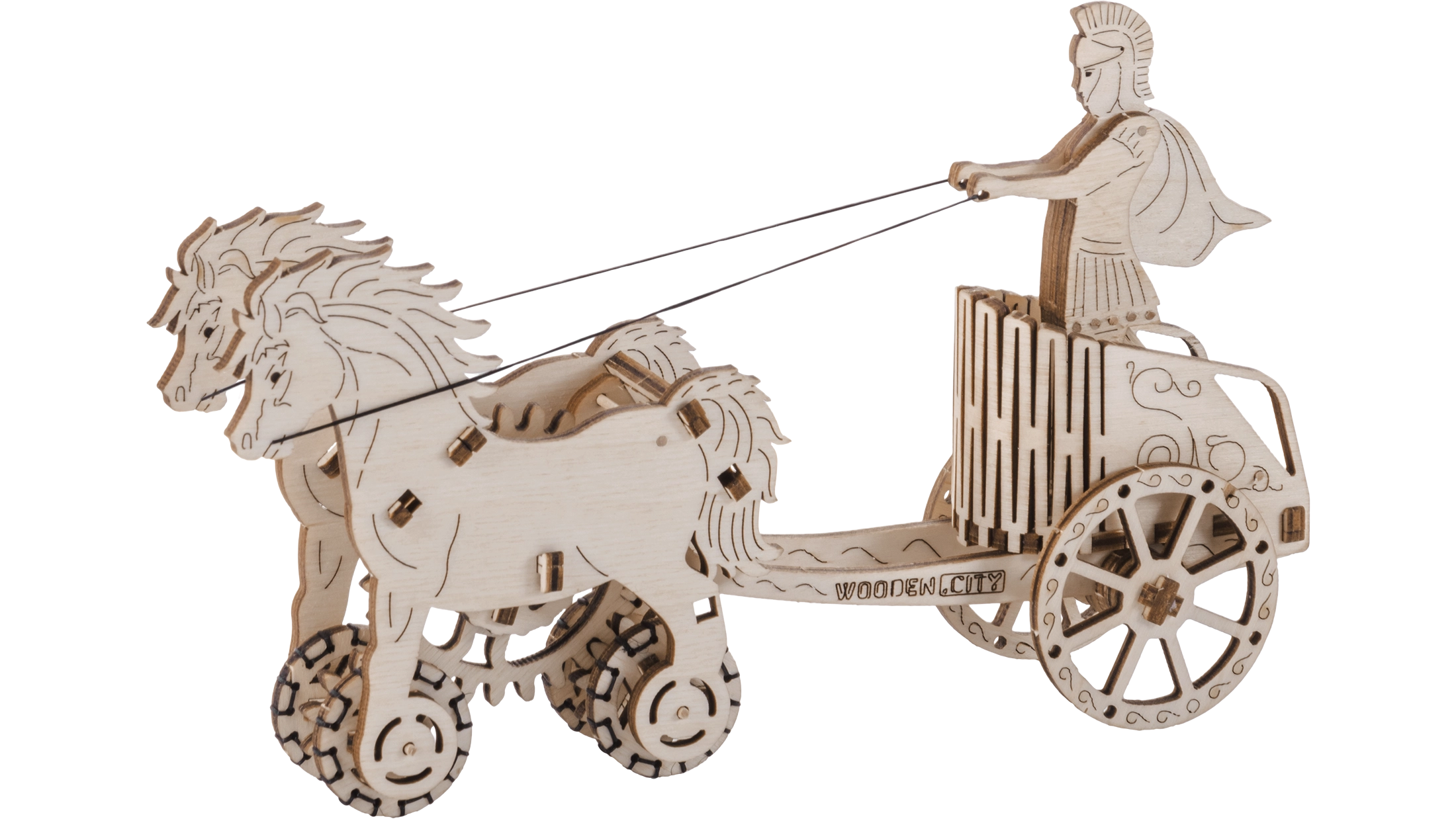 I imperiets navn. Byggesæt af en romersk vogn med dobbelt forspand, lavet af krydsfiner. I den troværdigt gengivne vogn er der placeret en detaljeret figur af en romersk rytter. Takket være det optrækkelige mekanisme kan modellen køre; ved start kan den få forspandet til at stejle og kører op til 1 meter. Arrangér løb med andre Wooden City-modeller! Udstyret med en detaljeret samlevejledning. Hovedfunktioner: 74 præcist udskårne dele, lav samlingssværhedsgrad, den færdige model kan køre selvstændigt