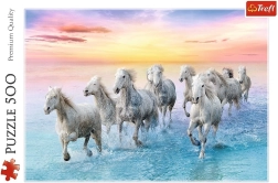 Puslespil, der indeholder 500 brikker, der viser skønheden og elegancen af hvide heste i fuld løb. Ved at samle dette puslespil opnår du et billede med dimensionerne 48x34 cm.
