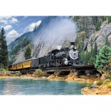 Puslespillet viser et historisk lokomotiv, der kører gennem et smukt bjerglandskab. Det betagende motiv er ideelt for togentusiaster og elsker af landskabsscener.