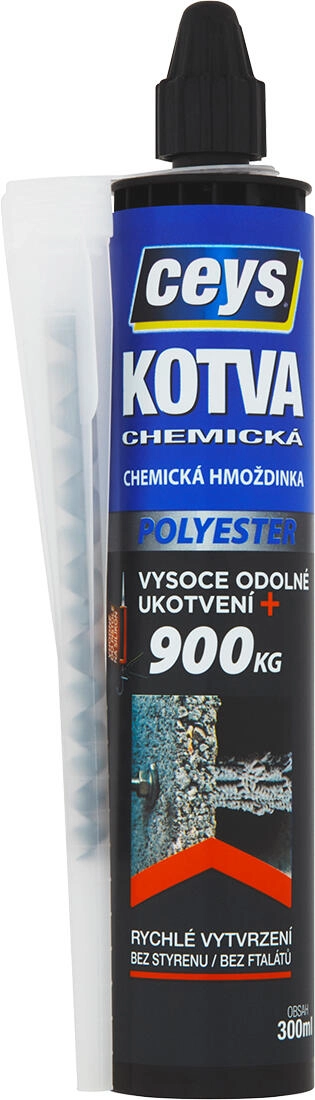 CEYS Kemisk anker polyester 300 ml er en hurtigt hærdende to-komponent masse til ekstremt stærk og sikker forankring i både hule og massive materialer. Takket være manglende ekspansion er den velegnet til montering, hvor der er risiko for revnedannelse i underlaget, og muliggør forankring tæt på kanter.