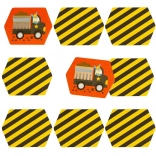 Hexagonale kort har en lys orange baggrund og dyr på byggemaskiner, der øger børns interesse for læring og opdagelse.